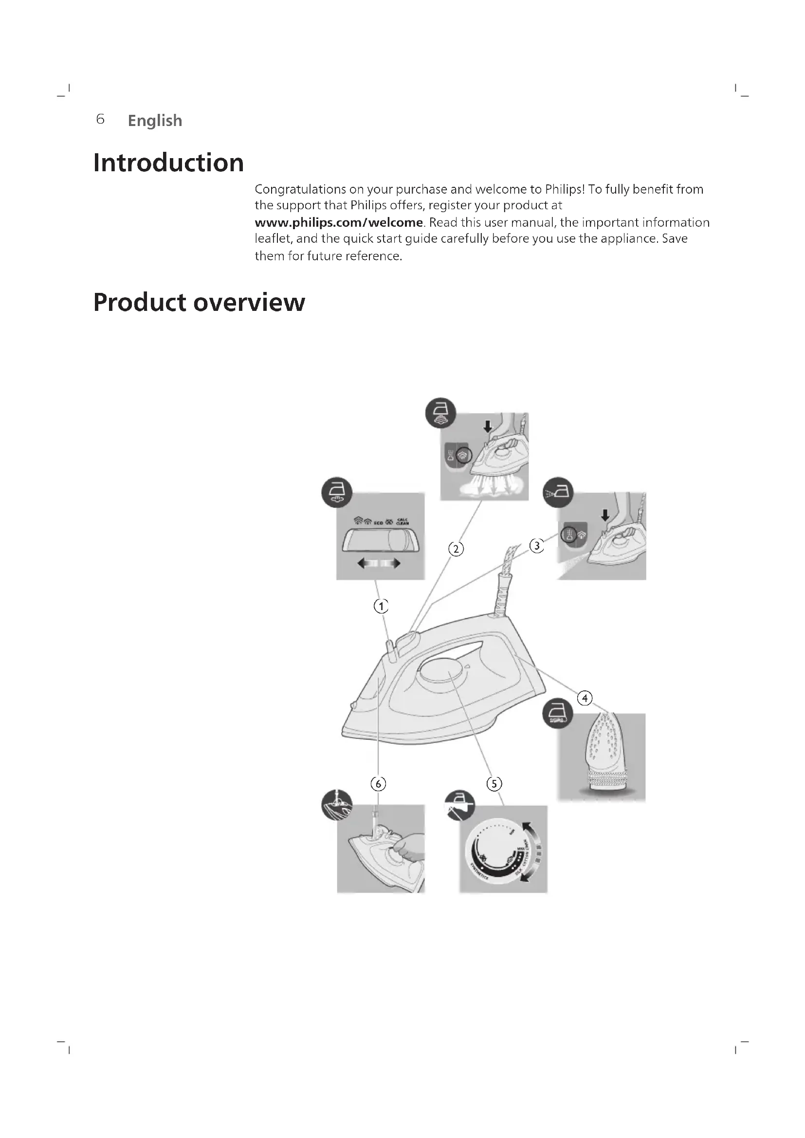 English Introduction Congratulations on your purchase and welcome to Philips! To fully benefit from the support that Philips offers, register your product at www.philips.com/welcome. Read this user manual, the important information leaflet, and the quick start guide carefully before you use the appliance. Save them for future reference. Product overview