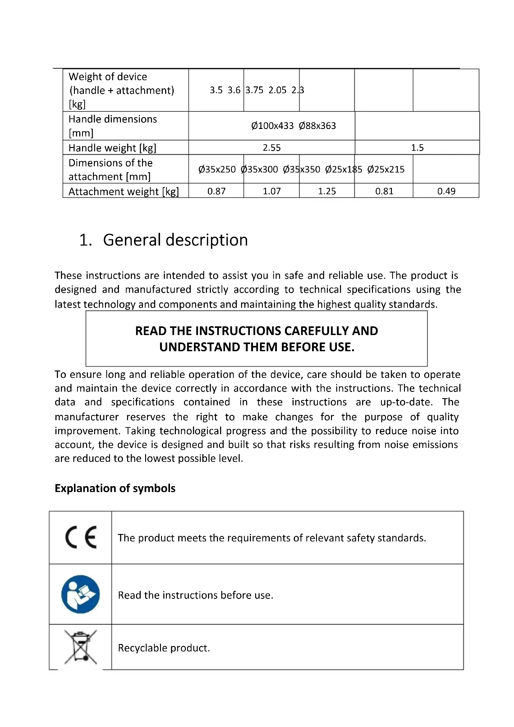 UNDERSTAND THEM BEFORE USE. To ensure long and reliable operation of the device, care should be taken to operate and maintain the device correctly in accordance with the instructions. The technical data and specifications contained in these instructions are up-to-date. The manufacturer reserves the right to make changes for the purpose of quality improvement. Taking technological progress and the possibility to reduce noise into account, the device is designed and built so that risks resulting from noise emissions are reduced to the lowest possible level. Explanation of symbols