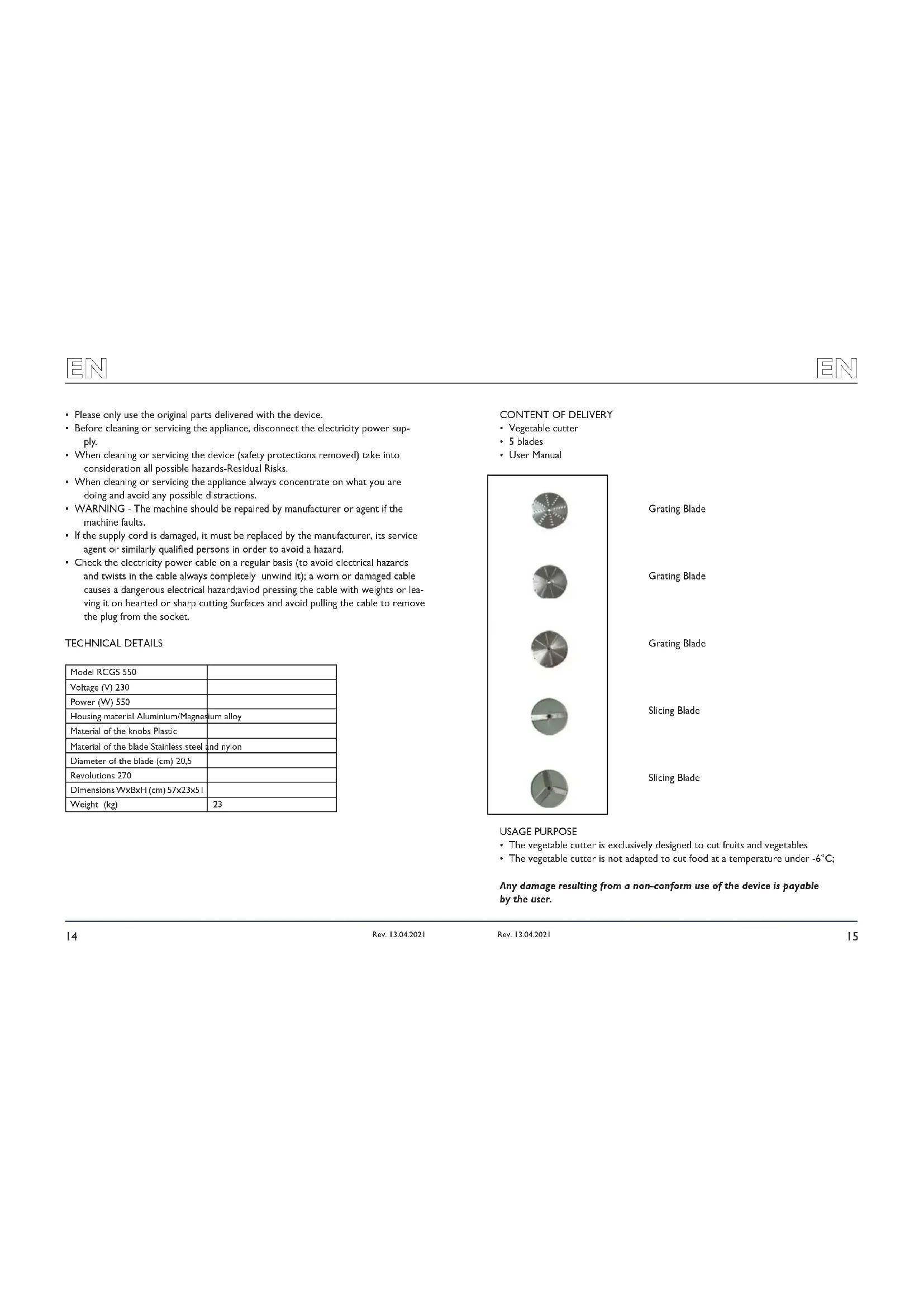 - Check the electricity power cable on a regular basis (to avoid electrical hazards and twists in the cable always completely unwind it); a worn or damaged cable causes a dangerous electrical hazard;aviod pressing the cable with weights or lea- ving it on hearted or sharp cutting Surfaces and avoid pulling the cable to remove the plug from the socket. TECHNICAL DETAILS Model RCGS 550 Voltage (V) 230 Power (W) 550 Housing material Aluminium/Magnesium alloy Material of the knobs Plastic Material of the blade Stainless steel and nylon Diameter of the blade (cm) 20,5 Revolutions 270 Dimensions WxBxH (cm) 57x23x51 Weight (kg) 23
