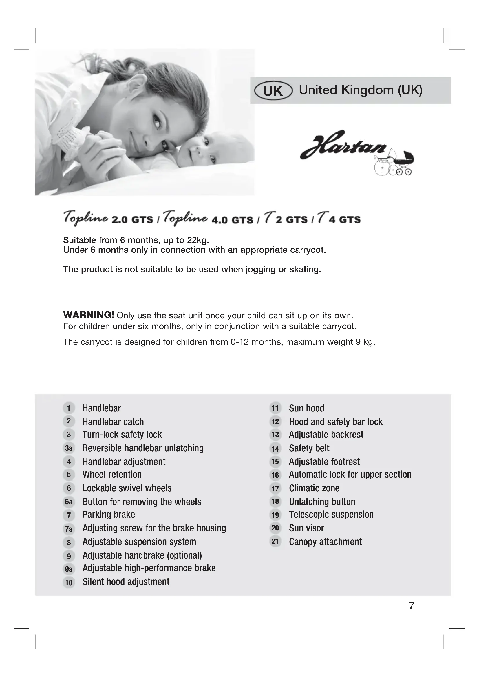 WARNING! Only use the seat unit once your child can sit up on its own. For children under six months, only in conjunction with a suitable carrycot.The carrycot is designed for children from 0-12 months, maximum weight 9 kg.