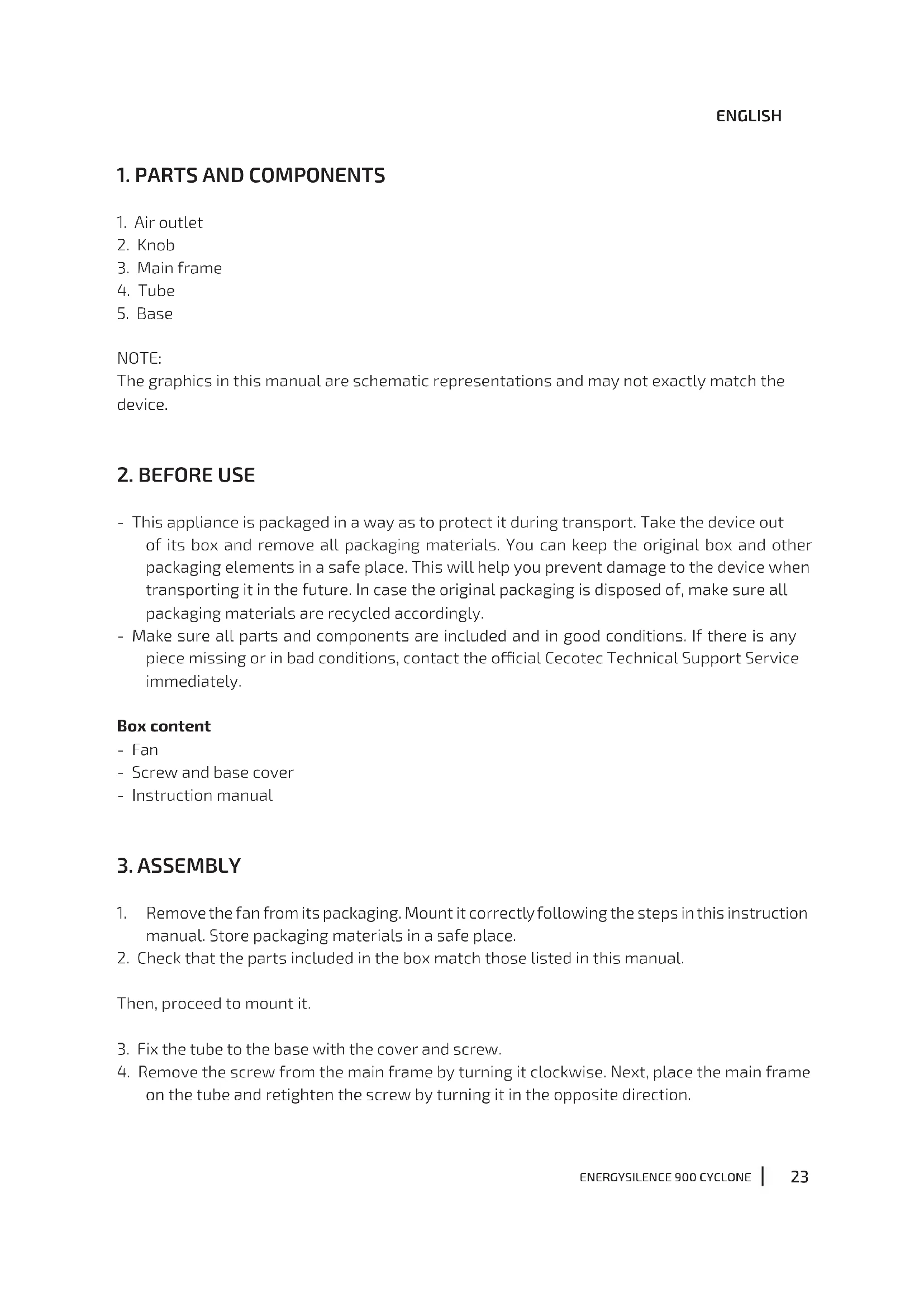 - This appliance is packaged in a way as to protect it during transport. Take the device out of its box and remove all packaging materials. You can keep the original box and other packaging elements in a safe place. This will help you prevent damage to the device when transporting it in the future. In case the original packaging is disposed of, make sure all packaging materials are recycled accordingly. - Make sure all parts and components are included and in good conditions. If there is any piece missing or in bad conditions, contact the ocial Cecotec Technical Support Service immediately. Box content - Fan - Screw and base cover - Instruction manual