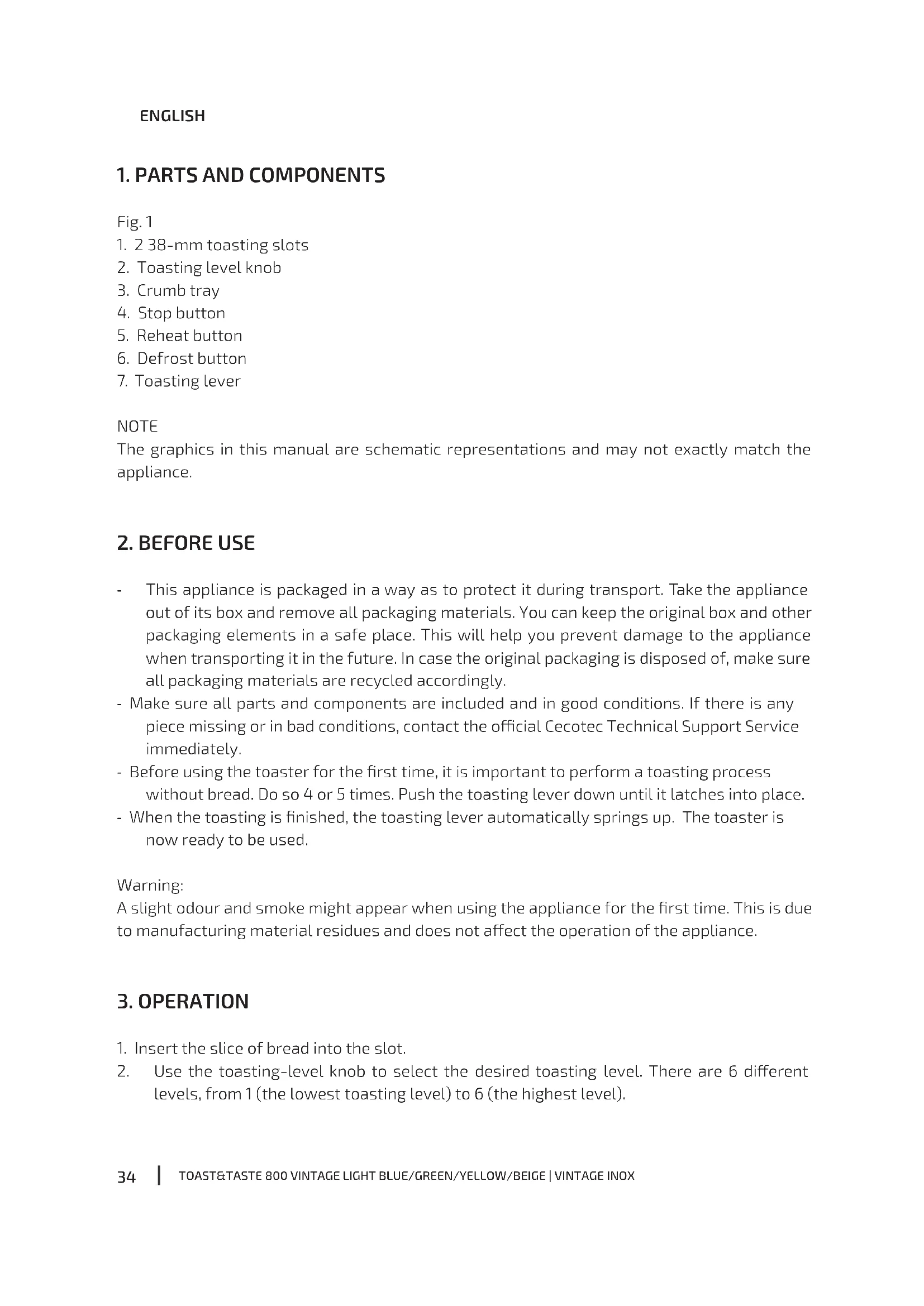- This appliance is packaged in a way as to protect it during transport. Take the appliance out of its box and remove all packaging materials. You can keep the original box and other packaging elements in a safe place. This will help you prevent damage to the appliance when transporting it in the future. In case the original packaging is disposed of, make sure all packaging materials are recycled accordingly. - Make sure all parts and components are included and in good conditions. If there is any piece missing or in bad conditions, contact the ocial Cecotec Technical Support Service immediately. - Before using the toaster for the rst time, it is important to perform a toasting process without bread. Do so 4 or 5 times. Push the toasting lever down until it latches into place. - When the toasting is nished, the toasting lever automatically springs up. The toaster is now ready to be used.