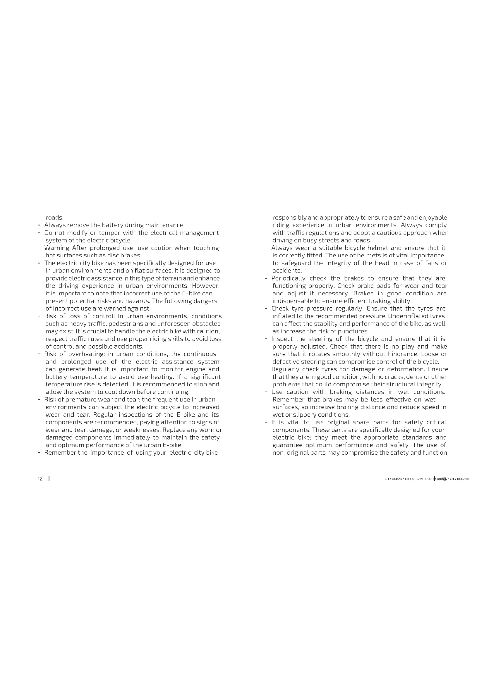 to replace them when they are worn and no longer provide good braking performance. Regularly inspect your brake pads and replace them if they are worn beyond the indicator or if they are no longer thick enough. If you are unsure or unfamiliar with how to adjust the gears, it is recommended that you take your electric bike to a specialist repair shop. We recommend that you have your vehicle serviced and maintained once every 6 months by a repair shop.CITY URBAN/ CITY URBAN PROCITY URBAN/ CITY URBAN PRO