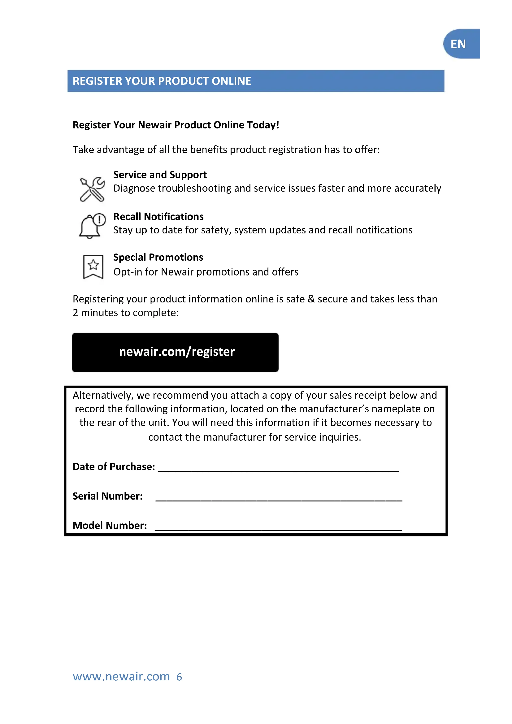 Alternatively, we recommend you attach a copy of your sales receipt below and record the following information, located on the manufacturer’s nameplate on the rear of the unit. You will need this information if it becomes necessary to contact the manufacturer for service inquiries. Date of Purchase: ___________________________________________ Serial Number: ____________________________________________ Model Number: ____________________________________________ newair.com/registerEN