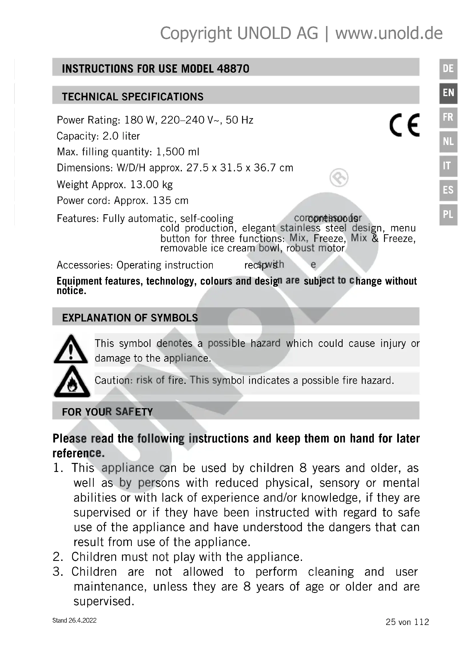 This symbol denotes a possible hazard which could cause injury or damage to the appliance. Caution: risk of fire. This symbol indicates a possible fire hazard. Copyright UNOLD AG | www.unold.de26 von 112 Stand 26.4.2022