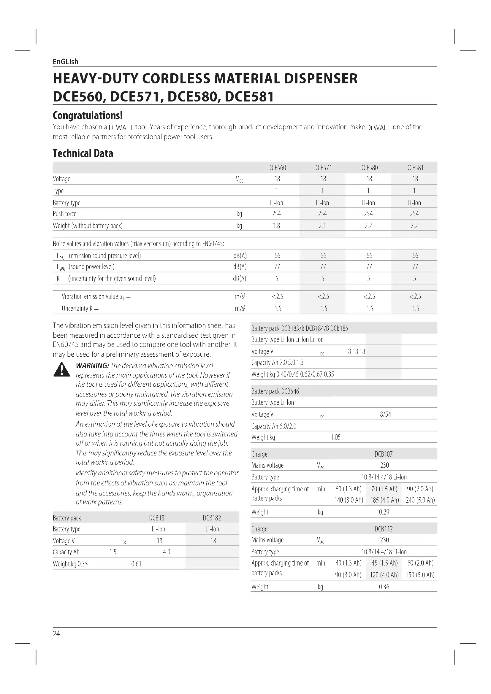 battery pack in a cool, dry place out of the charger for optimalresults. NOTE: Battery packs should not be stored completely depleted of charge. The battery pack will need to be recharged beforeuse. Example of Use and Transport Label Marking Labels on Charger and Battery Pack In addition to the pictographs used in this manual, the labels on the charger and the battery pack may show the following pictographs: Read instruction manual beforeuse. See Technical Data for chargingtime. Do not probe with conductiveobjects. Do not charge damaged batterypacks. Do not expose to water. Have defective cords replacedimmediately. Charge only between 4 ˚C and 40 ˚C. Only for indooruse. Discard the battery pack with due care for theenvironment. Charge DeWALT battery packs only with designated DeWALT chargers. Charging battery packs other than the designated DeWALT batteries with a DeWALT charger may make them burst or lead to other dangeroussituations. Do not incinerate the batterypack. Use: Use without transportation cap, Wh rating indicates 108 Wh (1 battery with 108 Wh). Transport: Transport with built-in transport cap, Wh rating indicates 3 x 36 Wh (3batteries of 36 Wh). Battery Type The DCE560, DCE571, DCE580 and DCE581 operate on a 18 volt batterypack. These battery packs may be used: DCB181, DCB182, DCB183, DCB183B, DCB184, DCB184B, DCB185, DCB546. Refer to Technical Data for moreinformation. Package Contents The package contains: 1 Cartridge holder (DCE560 and DCE581) 1 Sausage holder (DCE571, DCE580 and DCE581)31 ENGLISH 1 Dispenser 1 Short plunger Rod (DCE581) 1 Li-Ion battery pack 1 Instruction manual