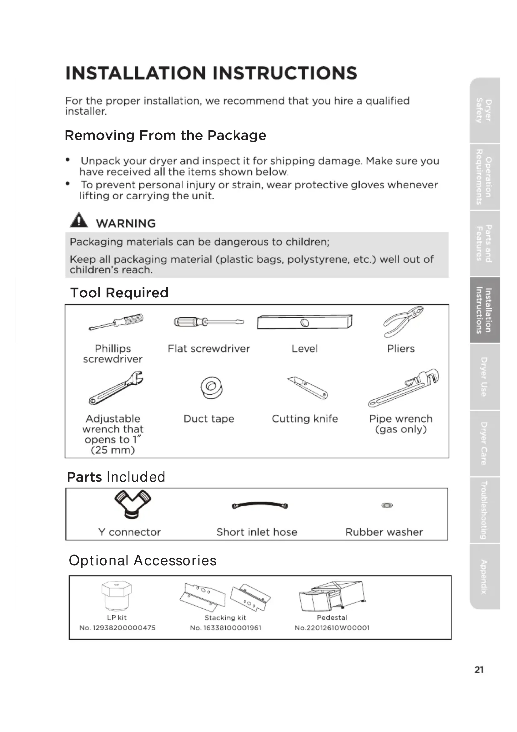 Filter CleanImportant to Installer -Basic Requirements Location Requirements is required for anDucting Requirements tatal 230 ft (70.1 m) 165 ft (50.3 m)Exhausting Requirements Gas Requirements RElectric RequirementselectricGroundingReplacement Parts and Accessories Reversible Door Lint Filter OptionalRemoving From the Package Tool Required Parts Included Optional AccessoriesChoose the Proper Location Install the Exhaust System shall be placed against a wall with a minimum clearance of 5 inches (127 mm).See Duct