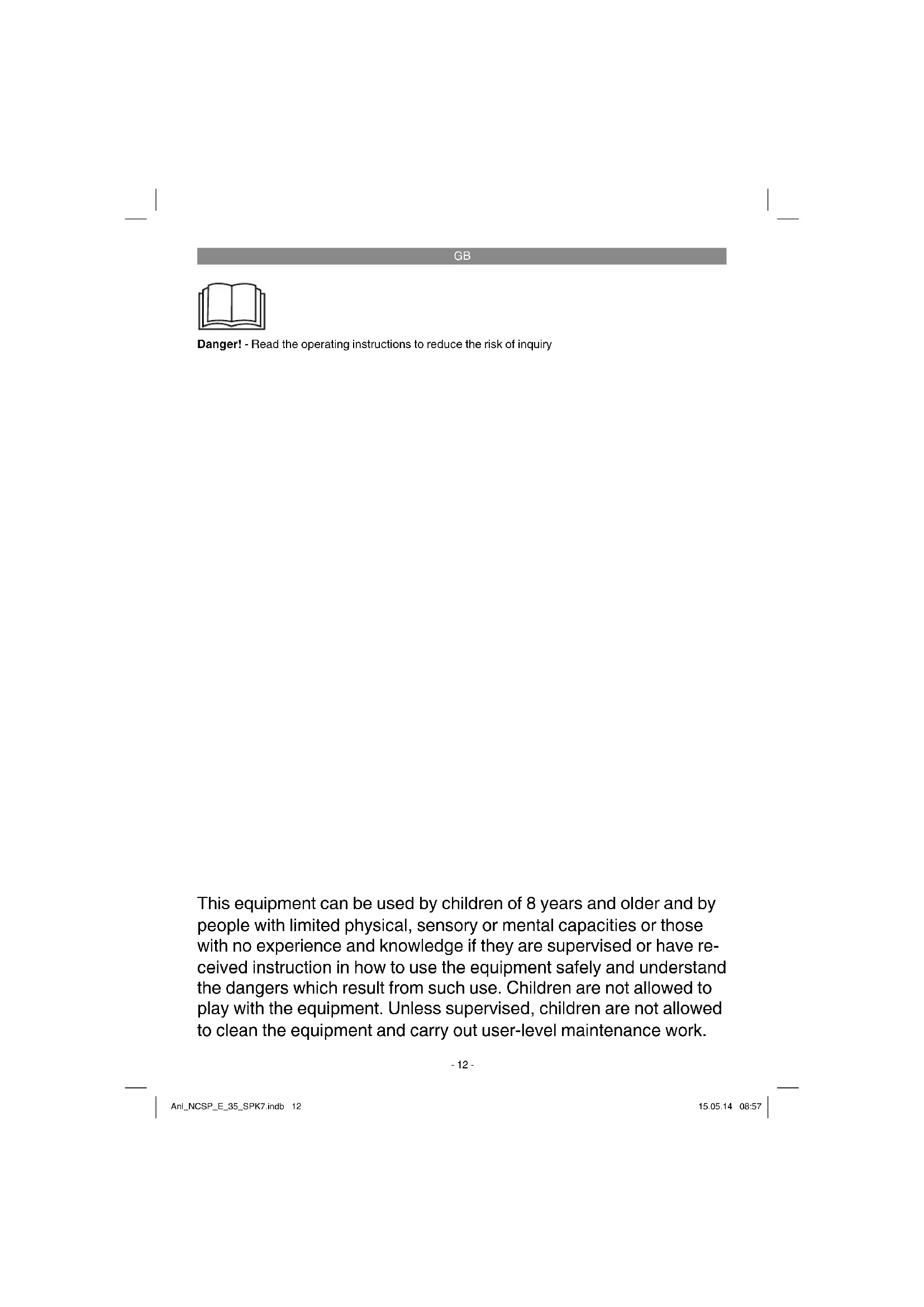 Danger! - Read the operating instructions to reduce the risk of inquiry This equipment can be used by children of 8 years and older and by people with limited physical, sensory or mental capacities or those with no experience and knowledge if they are supervised or have re- ceived instruction in how to use the equipment safely and understand the dangers which result from such use. Children are not allowed to play with the equipment. Unless supervised, children are not allowed to clean the equipment and carry out user-level maintenance work. Anl_NCSP_E_35_SPK7.indb 12Anl_NCSP_E_35_SPK7.indb 12 15.05.14 08:5715.05.14 08:57GB