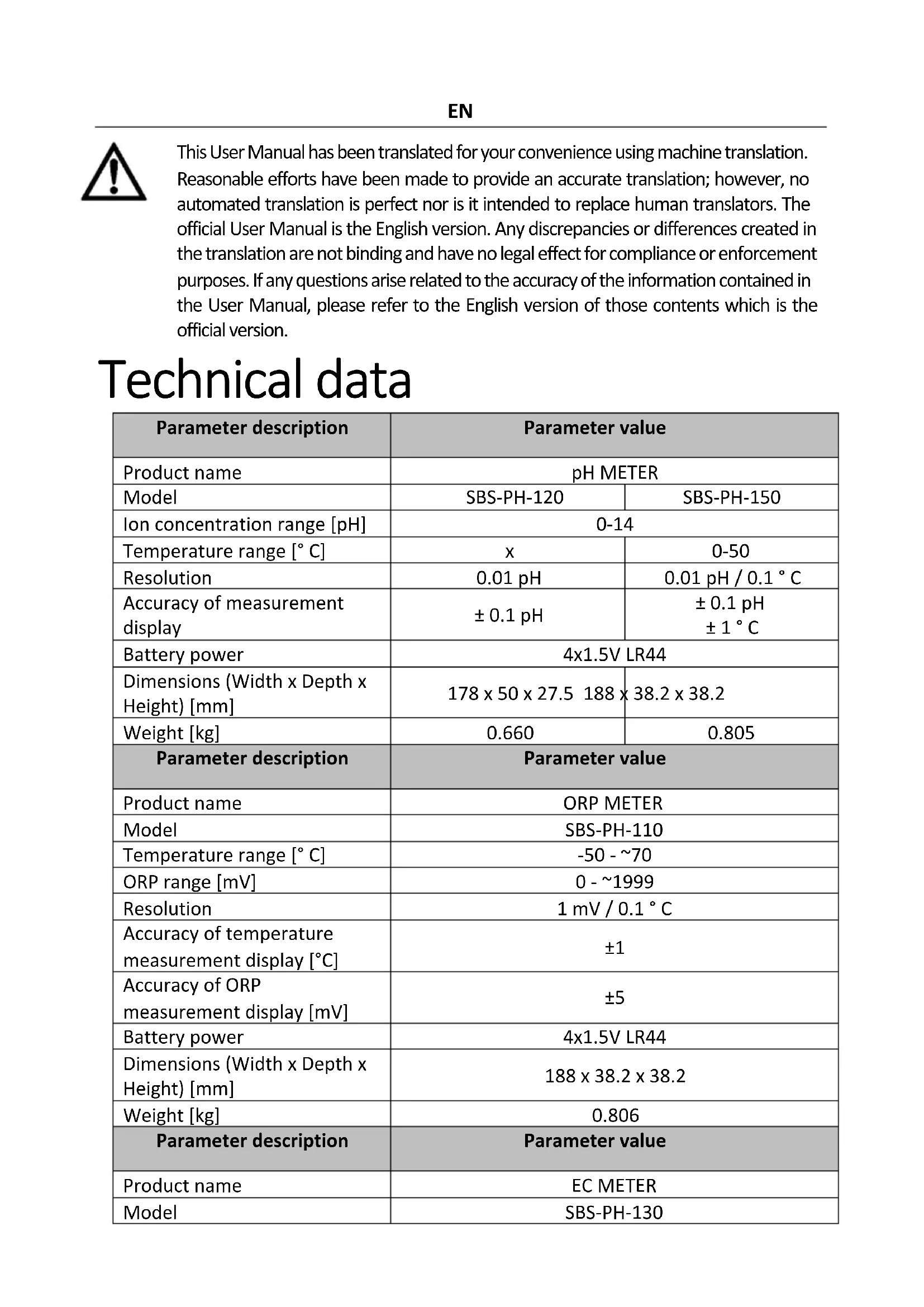Parameter description Parameter value Product name EC METER Model SBS-PH-130 This User Manual has been translated for your convenience using machine translation. Reasonable efforts have been made to provide an accurate translation; however, no automated translation is perfect nor is it intended to replace human translators. The official User Manual is the English version. Any discrepancies or differences created in the translation are not binding and have no legal effect for compliance or enforcement purposes. If any questions arise related to the accuracy of the information contained in the User Manual, please refer to the English version of those contents which is the official version.EN EC conductivity range [us/cm]