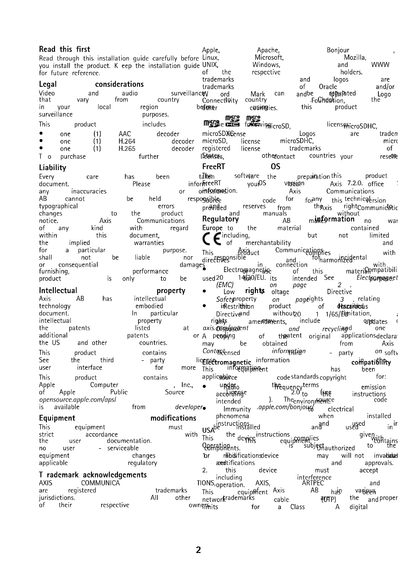 - one (1) H.265 decoder license T o purchase further licenses, contact your reseller . Liability Every care has been taken in the preparation of this document. Please inform your local Axis ofce of any inaccuracies or omissions. Axis Communications AB cannot be held responsible for any technical or typographical errors and reserves the right to make changes to the product and manuals without prior notice. Axis Communications AB makes no warranty of any kind with regard to the material contained within this document, including, but not limited to, the implied warranties of merchantability and tness for a particular purpose. Axis Communications AB shall not be liable nor responsible for incidental or consequential damages in connection with the furnishing, performance or use of this material. This product is only to be used for its intended purpose. Intellectual property rights Axis AB has intellectual property rights relating to technology embodied in the product described in this document. In particular , and without limitation, these intellectual property rights may include one or more of the patents listed at axis.com/patent and one or more additional patents or pending patent applications in the US and other countries. This product contains licensed third - party software. See the third - party license information in the product’s user interface for more information. This product contains source code copyright Apple Computer , Inc., under the terms of Apple Public Source License 2.0 (see opensource.apple.com/apsl ). The source code is available from developer .apple.com/bonjour/ . Equipment modications This equipment must be installed and used in strict accordance with the instructions given in the user documentation. This equipment contains no user - serviceable components. Unauthorized equipment changes or modications will invalidate all applicable regulatory certications and approvals. T rademark acknowledgements AXIS COMMUNICA TIONS, AXIS, ARTPEC and VAPIX are registered trademarks of Axis AB in various jurisdictions. All other trademarks are the property of their respective owners. Apple, Apache, Bonjour , Ethernet, Internet Explorer , Linux, Microsoft, Mozilla, Real, SMPTE, QuickTime, UNIX, Windows, and WWW are registered trademarks of the respective holders. Java and all Java - based trademarks and logos are trademarks or registered trademarks of Oracle and/or its afliates. The UPnP W ord Mark and UPnP Logo are trademarks of Open Connectivity Foundation, Inc. in the United States or other countries. microSD, microSDHC, and microSDXC Logos are trademarks of SD - 3C LLC. microSD, microSDHC, microSDXC are trademarks or registered trademarks of SD - 3C, LLC in the United States, other countries or both. FreeRT OS The software in this product is based on FreeRT OS version 7.2.0. See freertos.org for more information. Source code for this version of FreeRT OS can be provided from Axis Communications AB upon request. Regulatory information Europe This product complies with the applicable CE marking directives and harmonized standards: