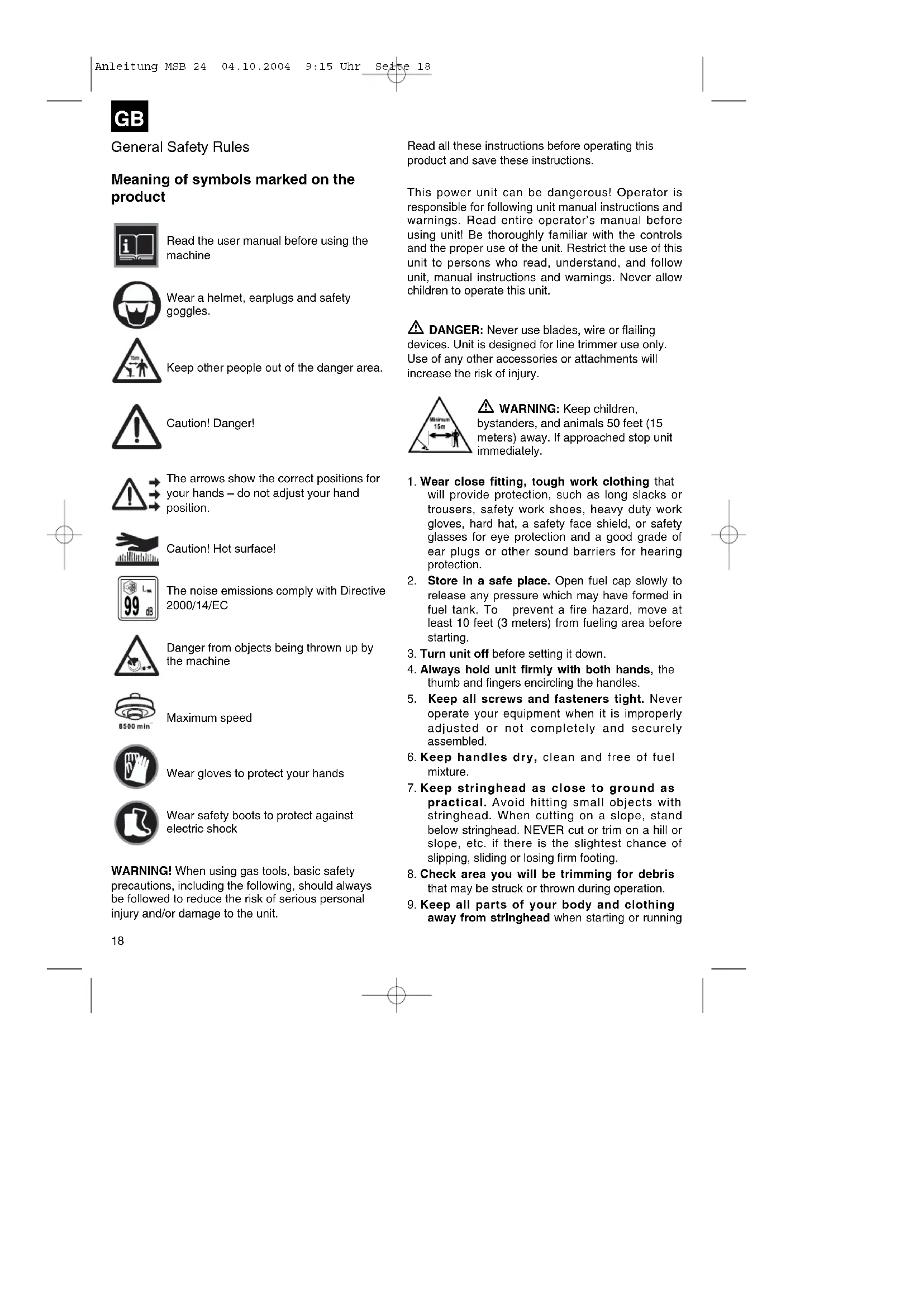 and Lubrication Section. Trouble shooting the engine PROBABLE CAUSE Incorrect starting procedures. Incorrect carburetor mixture adjustment setting. Fouled spark plug Fuel filter plugged. Incorrect lever position on choke. Dirty air filter. Incorrect carburetor mixture adjustment setting. Incorrect carburetor mixture adjustment setting. Incorrectly gapped spark plug. Incorrect carburetor mixture adjustment setting. Incorrect fuel mixture. CORRECTIVE ACTION Follow instructions in the User Manual. Have carburetor adjusted by an Authorized Service Center. Clean / gap or replace plug. Replace fuel filter. Move to RUN position. Remove, clean and reinstall filter. Have carburetor adjusted by an Authorized Service Center. Have carburetor adjusted by an Authorized Service Center. Clean / gap or replace plug. Have carburetor adjusted by an Authorized Service Center. Use properly mixed fuel (40:1 mixture). Anleitung MSB 24 04.10.2004 9:15 Uhr Seite 25F