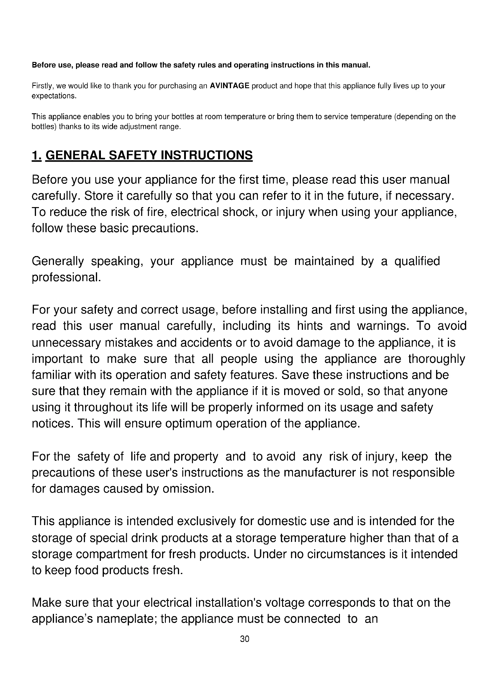 Before you use your appliance for the first time, please read this user manual carefully. Store it carefully so that you can refer to it in the future, if necessary. To reduce the risk of fire, electrical shock, or injury when using your appliance, follow these basic precautions. Generally speaking, your appliance must be maintained by a qualified professional. For your safety and correct usage, before installing and first using the appliance, read this user manual carefully, including its hints and warnings. To avoid unnecessary mistakes and accidents or to avoid damage to the appliance, it is important to make sure that all people using the appliance are thoroughly familiar with its operation and safety features. Save these instructions and be sure that they remain with the appliance if it is moved or sold, so that anyone using it throughout its life will be properly informed on its usage and safety notices. This will ensure optimum operation of the appliance. For the safety of life and property and to avoid any risk of injury, keep the precautions of these user's instructions as the manufacturer is not responsible for damages caused by omission. This appliance is intended exclusively for domestic use and is intended for the storage of special drink products at a storage temperature higher than that of a storage compartment for fresh products. Under no circumstances is it intended to keep food products fresh. Make sure that your electrical installation's voltage corresponds to that on the appliance’s nameplate; the appliance must be connected to an31 approved, earthed system. Incorrect repairs or connections can cause safety hazards. Have your electrical installation checked by a professional, if you are in any doubt. This unit must be correctly connected to an earthed socket for your protection. Do not cut off or remove the earth wire on the mains cable supplied. For safety reasons, do not use an electrical extension cable. If your appliance is damaged (e.g. a major impact) or suffers harm (power surge due to lightning, flood, fire), it may be dangerous to use. Disconnect the mains plug and have the appliance checked by an approved professional repairer. To prevent any danger, do not replace a damaged mains cable yourself. Contact your retailer, an approved service center or professional repairer. This appliance must be positioned such that the mains socket is accessible. Do not move the appliance once it is full: you might distort its body beyond repair. The electrical parts must not be directly accessible.