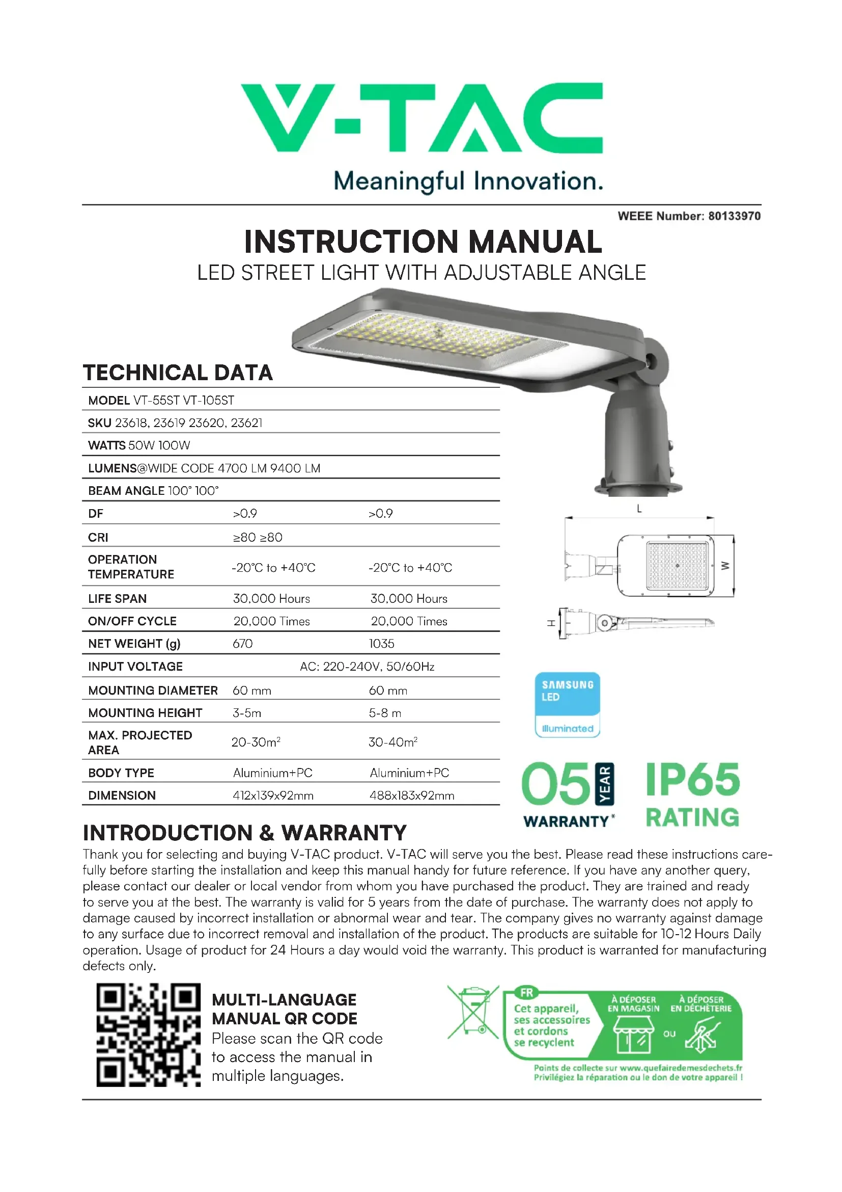 TECHNICAL DATA INTRODUCTION & WARRANTY Thank you for selecting and buying V-TAC product. V-TAC will serve you the best. Please read these instructions care- fully before starting the installation and keep this manual handy for future reference. If you have any another query, please contact our dealer or local vendor from whom you have purchased the product. They are trained and ready to serve you at the best. The warranty is valid for 5 years from the date of purchase. The warranty does not apply to damage caused by incorrect installation or abnormal wear and tear. The company gives no warranty against damage to any surface due to incorrect removal and installation of the product. The products are suitable for 10-12 Hours Daily operation. Usage of product for 24 Hours a day would void the warranty. This product is warranted for manufacturing defects only. MODEL VT-55ST VT-105STSKU 23618, 23619 23620, 23621WATTS 50W 100WLUMENS@WIDE CODE 4700 LM 9400 LMBEAM ANGLE 100° 100°DF >0.9 >0.9CRI ≥80 ≥80OPERATIONTEMPERATURE-20°C to +40°C -20°C to +40°CLIFE SPAN 30,000 Hours 30,000 HoursON/OFF CYCLE 20,000 Times 20,000 Times NET WEIGHT (g) 670 1035 INPUT VOLTAGE AC: 220-240V, 50/60HzMOUNTING DIAMETER 60 mm 60 mmMOUNTING HEIGHT 3-5m 5-8 mMAX. PROJECTED AREA 20-30m 30-40m BODY TYPE Aluminium+PC Aluminium+PCDIMENSION 412x139x92mm 488x183x92mm MULTI-LANGUAGE