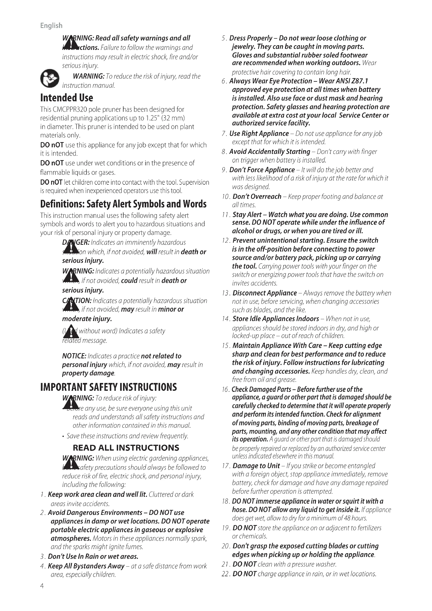 (Used without word) Indicates a safety relatedmessage. NOTICE: Indicates a practice not related to personal injury which, if not avoided, may result in propertydamage. Intended Use This CMCPPR320 pole pruner has been designed for residential pruning applications up to 1.25" (32mm) indiameter. This pruner is intended to be used on plant materials only. DO nOT use this appliance for any job except that for which it isintended. DO nOT use under wet conditions or in the presence of flammable liquids orgases. DO nOT let children come into contact with the tool. Supervision is required when inexperienced operators use thistool. English (original instructions)
