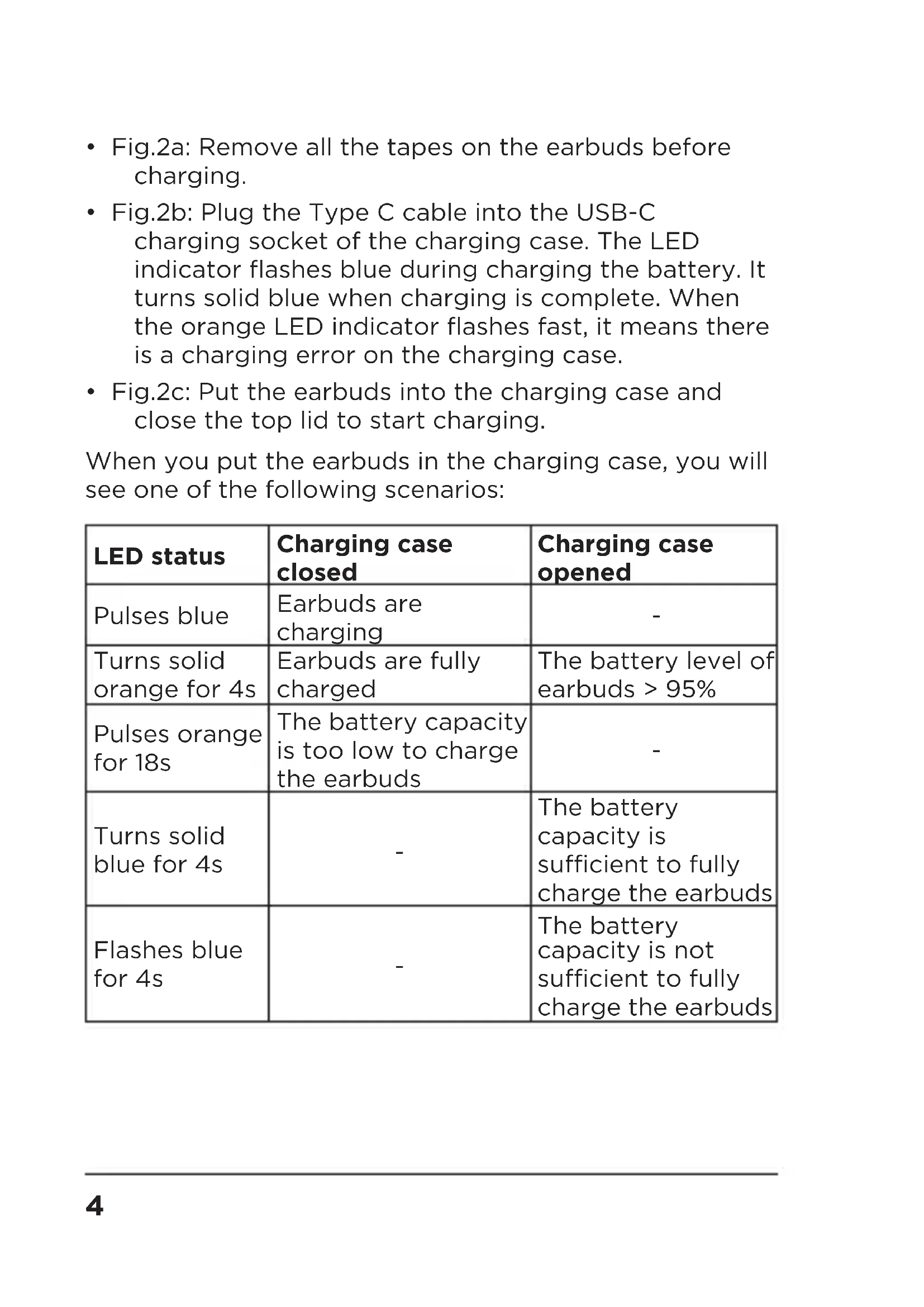 - Fig.2c: Put the earbuds into the charging case and close the top lid to start charging. When you put the earbuds in the charging case, you will see one of the following scenarios: LED status Charging case closed Charging case opened Pulses blue Earbuds are charging