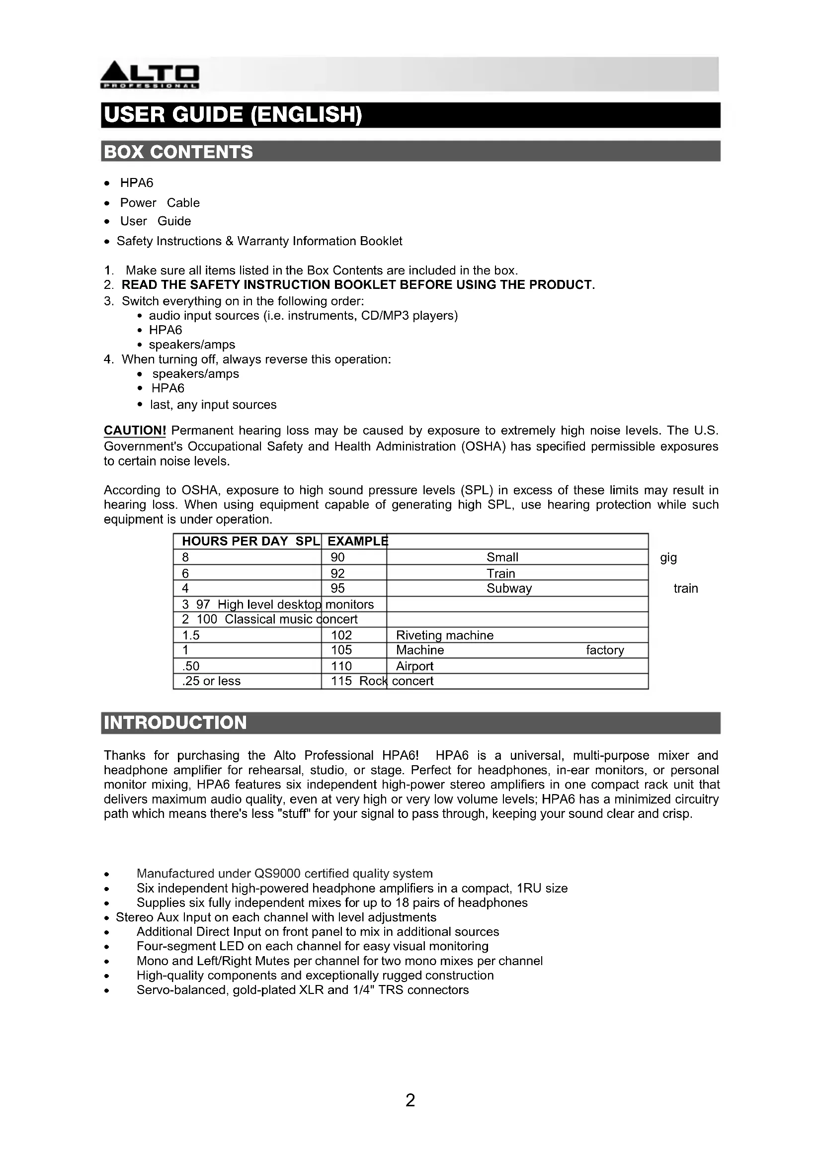 INTRODUCTION Thanks for purchasing the Alto Professional HPA6! HPA6 is a universal, multi-purpose mixer and headphone amplifier for rehearsal, studio, or stage. Perfect for headphones, in-ear monitors, or personal monitor mixing, HPA6 features six independent high-power stereo amplifiers in one compact rack unit that delivers maximum audio quality, even at very high or very low volume levels; HPA6 has a minimized circuitry path which means there's less "stuff" for your signal to pass through, keeping your sound clear and crisp.