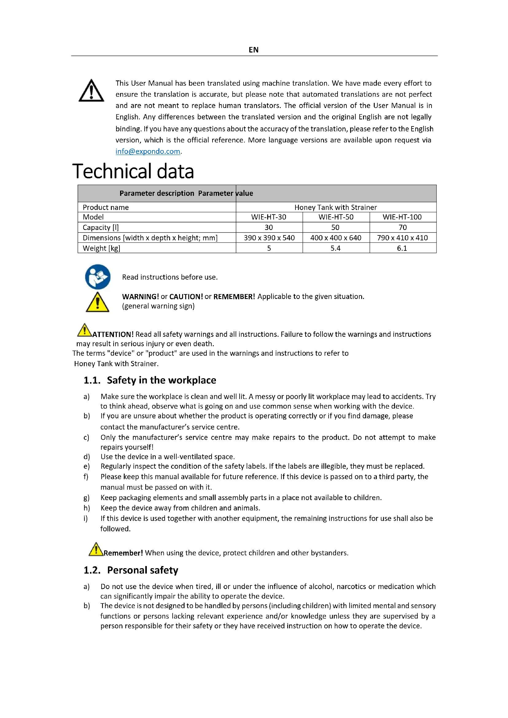 REMEMBER! Applicable to the given situation. (general warning sign) ATTENTION! Read all safety warnings and all instructions. Failure to follow the warnings and instructions may result in serious injury or even death. The terms "device" or "product" are used in the warnings and instructions to refer to Honey Tank with Strainer. 1.1. Safety in the workplace a) Make sure the workplace is clean and well lit. A messy or poorly lit workplace may lead to accidents. Try to think ahead, observe what is going on and use common sense when working with the device. b) If you are unsure about whether the product is operating correctly or if you find damage, please contact the manufacturer’s service centre. c) Only the manufacturer’s service centre may make repairs to the product. Do not attempt to make repairs yourself! d) Use the device in a well-ventilated space. e) Regularly inspect the condition of the safety labels. If the labels are illegible, they must be replaced. f) Please keep this manual available for future reference. If this device is passed on to a third party, the manual must be passed on with it. g) Keep packaging elements and small assembly parts in a place not available to children. h) Keep the device away from children and animals.