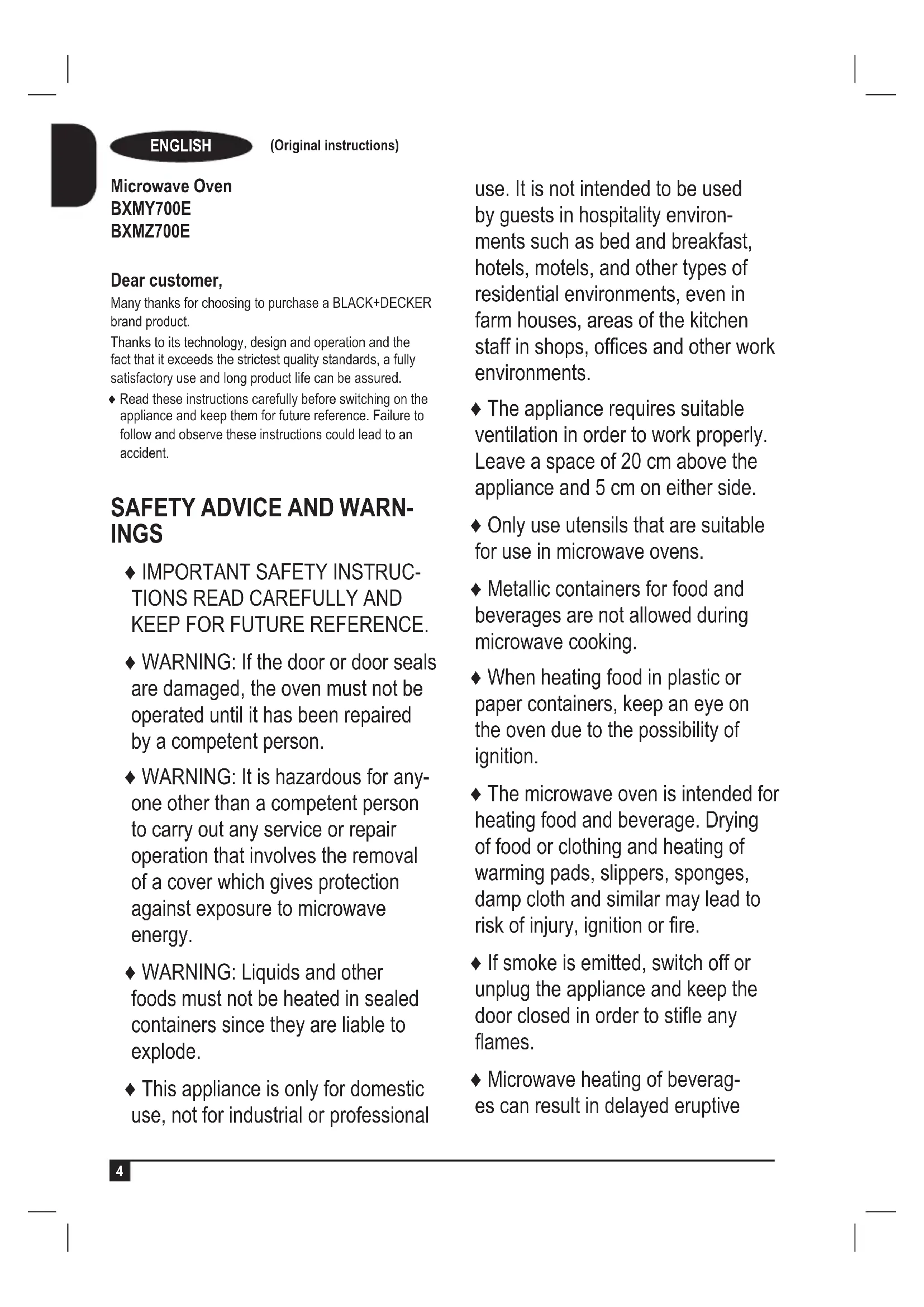 Microwave Oven BXMY700E BXMZ700E Dear customer, Many thanks for choosing to purchase a BLACK+DECKER brand product. Thanks to its technology, design and operation and the fact that it exceeds the strictest quality standards, a fully satisfactory use and long product life can be assured. ♦ Read these instructions carefully before switching on the appliance and keep them for future reference. Failure to follow and observe these instructions could lead to an accident.