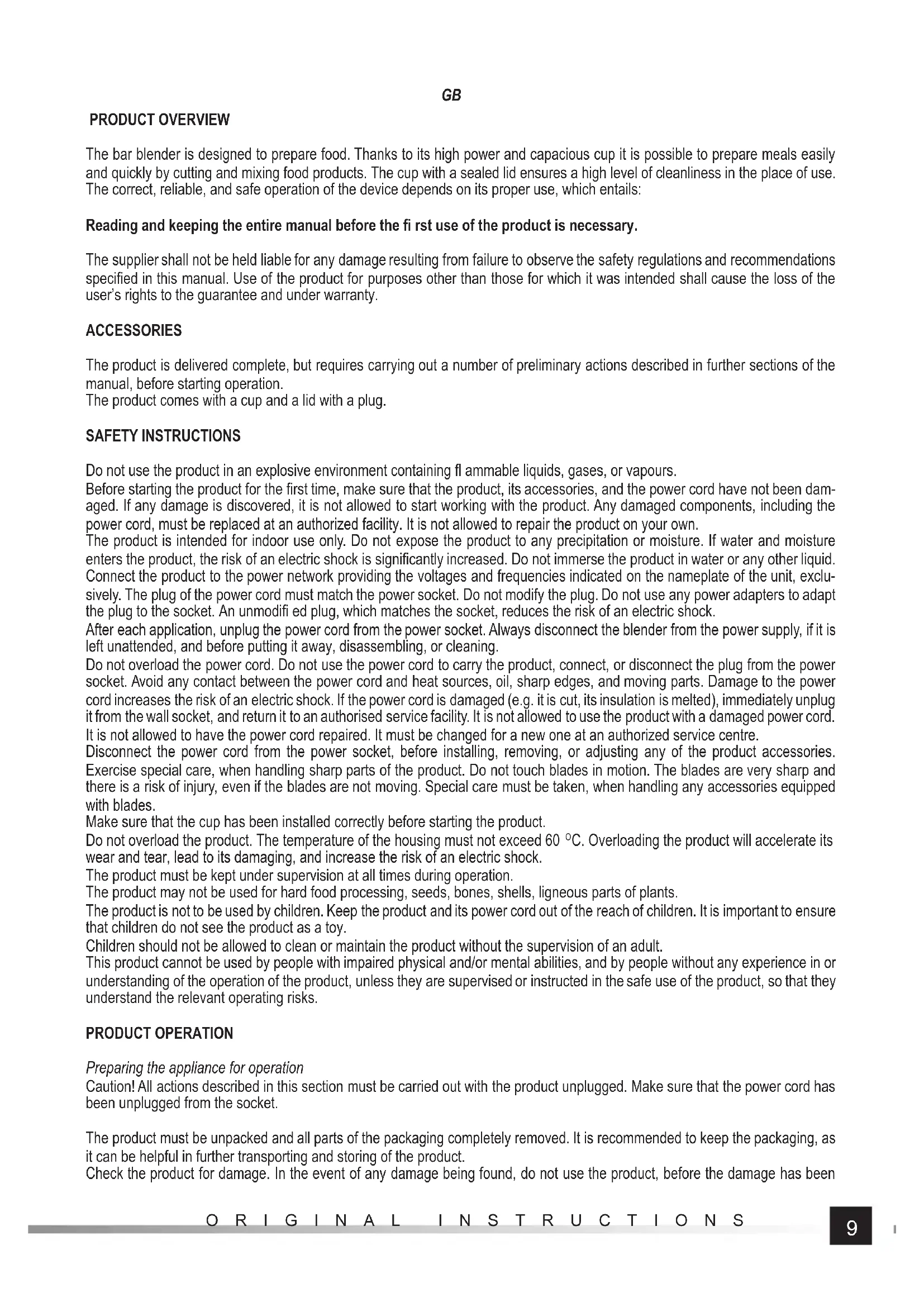 ORIGINAL INSTRUCTIONS PRODUCT OVERVIEW The bar blender is designed to prepare food. Thanks to its high power and capacious cup it is possible to prepare meals easily and quickly by cutting and mixing food products. The cup with a sealed lid ensures a high level of cleanliness in the place of use. The correct, reliable, and safe operation of the device depends on its proper use, which entails: Reading and keeping the entire manual before the fi rst use of the product is necessary. The supplier shall not be held liable for any damage resulting from failure to observe the safety regulations and recommendations specifi ed in this manual. Use of the product for purposes other than those for which it was intended shall cause the loss of the user’s rights to the guarantee and under warranty. ACCESSORIES The product is delivered complete, but requires carrying out a number of preliminary actions described in further sections of the manual, before starting operation. The product comes with a cup and a lid with a plug. SAFETY INSTRUCTIONS Do not use the product in an explosive environment containing fl ammable liquids, gases, or vapours. Before starting the product for the fi rst time, make sure that the product, its accessories, and the power cord have not been dam- aged. If any damage is discovered, it is not allowed to start working with the product. Any damaged components, including the power cord, must be replaced at an authorized facility. It is not allowed to repair the product on your own. The product is intended for indoor use only. Do not expose the product to any precipitation or moisture. If water and moisture enters the product, the risk of an electric shock is signifi cantly increased. Do not immerse the product in water or any other liquid. Connect the product to the power network providing the voltages and frequencies indicated on the nameplate of the unit, exclu- sively. The plug of the power cord must match the power socket. Do not modify the plug. Do not use any power adapters to adapt the plug to the socket. An unmodifi ed plug, which matches the socket, reduces the risk of an electric shock. After each application, unplug the power cord from the power socket. Always disconnect the blender from the power supply, if it is left unattended, and before putting it away, disassembling, or cleaning. Do not overload the power cord. Do not use the power cord to carry the product, connect, or disconnect the plug from the power socket. Avoid any contact between the power cord and heat sources, oil, sharp edges, and moving parts. Damage to the power cord increases the risk of an electric shock. If the power cord is damaged (e.g. it is cut, its insulation is melted), immediately unplug it from the wall socket, and return it to an authorised service facility. It is not allowed to use the product with a damaged power cord. It is not allowed to have the power cord repaired. It must be changed for a new one at an authorized service centre. Disconnect the power cord from the power socket, before installing, removing, or adjusting any of the product accessories. Exercise special care, when handling sharp parts of the product. Do not touch blades in motion. The blades are very sharp and there is a risk of injury, even if the blades are not moving. Special care must be taken, when handling any accessories equipped with blades. Make sure that the cup has been installed correctly before starting the product. Do not overload the product. The temperature of the housing must not exceed 60