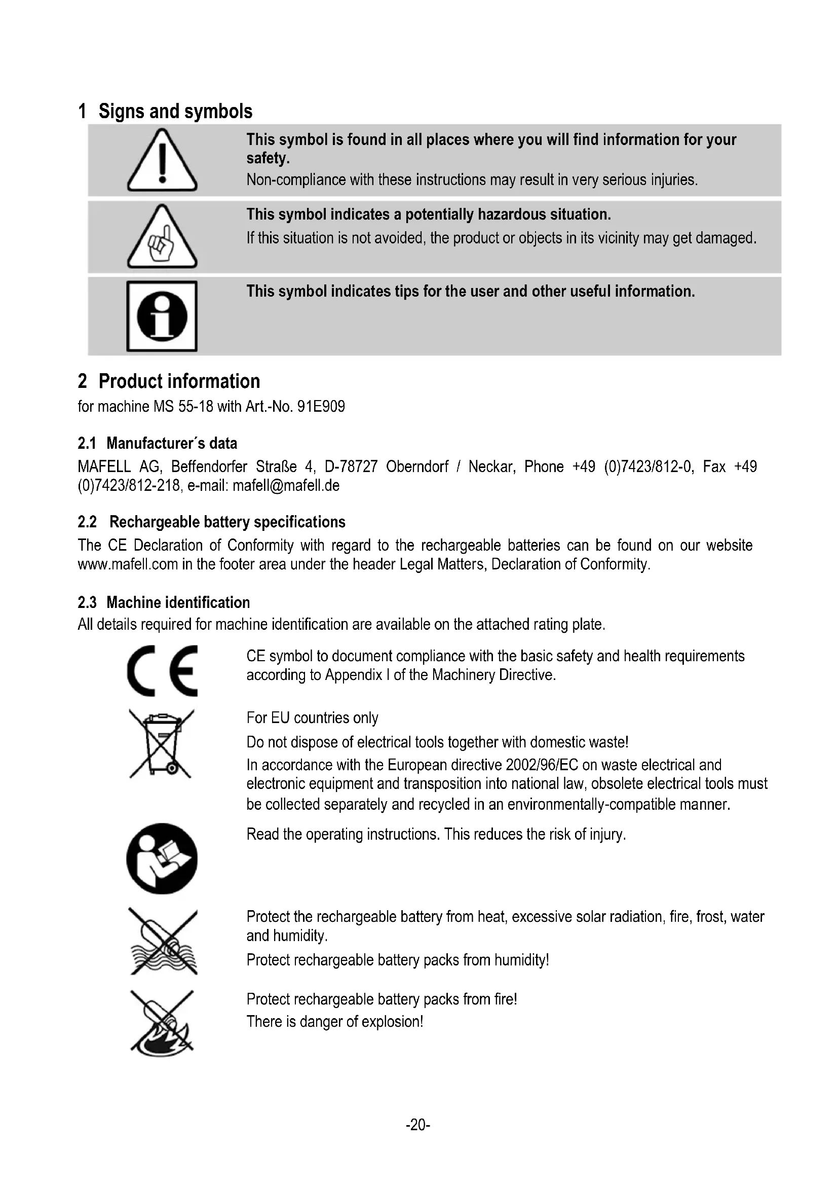 The CE Declaration of Conformity with regard to the rechargeable batteries can be found on our website www.mafell.com in the footer area under the header Legal Matters, Declaration of Conformity.