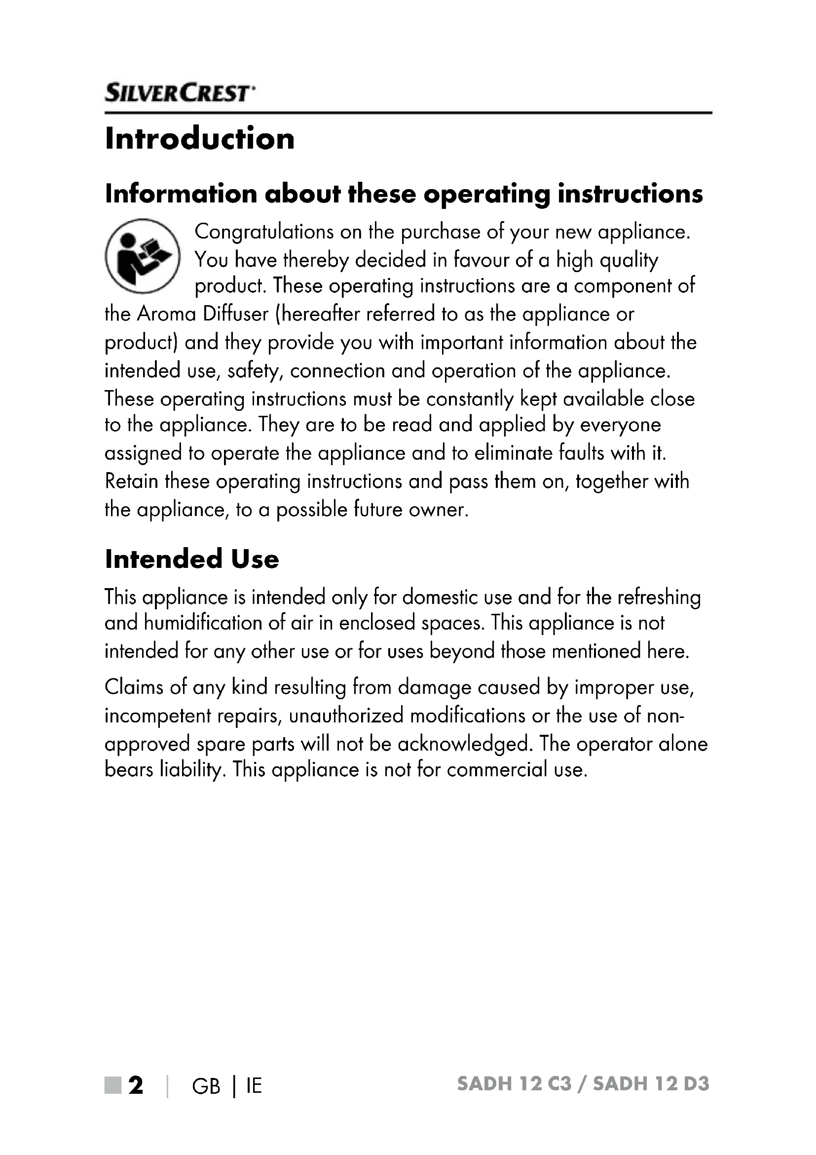 Introduction Information about these operating instructions Congratulations on the purchase of your new appliance. You have thereby decided in favour of a high quality product. These operating instructions are a component of the Aroma Diffuser (hereafter referred to as the appliance or product) and they provide you with important information about the intended use, safety, connection and operation of the appliance. These operating instructions must be constantly kept available close to the appliance. They are to be read and applied by everyone assigned to operate the appliance and to eliminate faults with it. Retain these operating instructions and pass them on, together with the appliance, to a possible future owner. Intended Use This appliance is intended only for domestic use and for the refreshing and humidification of air in enclosed spaces. This appliance is not intended for any other use or for uses beyond those mentioned here. Claims of any kind resulting from damage caused by improper use, incompetent repairs, unauthorized modifications or the use of non- approved spare parts will not be acknowledged. The operator alone bears liability. This appliance is not for commercial use.GB
