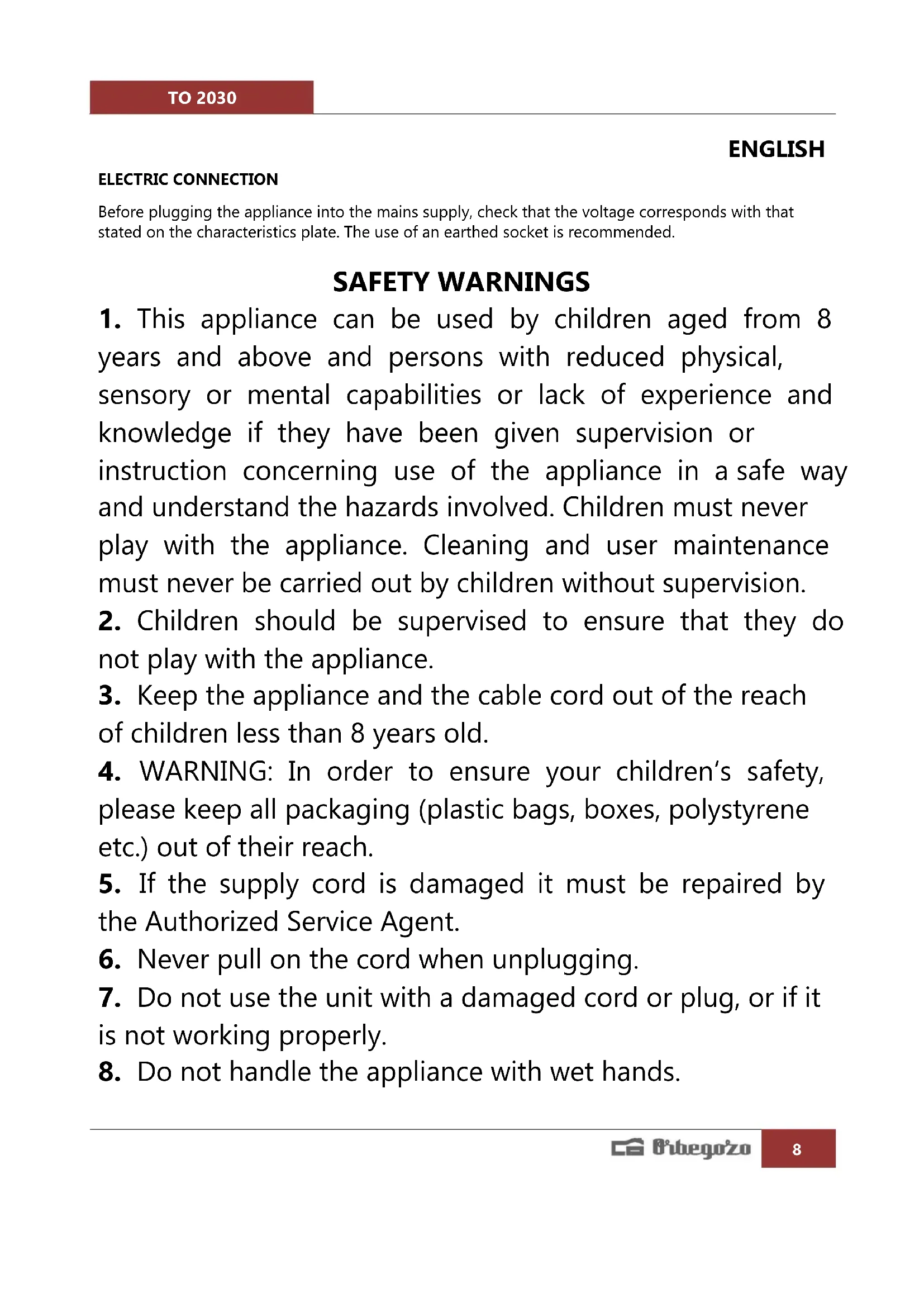 Keep the toaster away from any sources of heat. Never leave the able hanging freely, nor allow it to come into contact with hot surfaced. Never lay the toaster on his side while it is still switched on. Do not use the toaster in the crumb tray if not fitted correctly. The toaster can get very hot when it is operating. Do not touch the hot surfaces, use the handles. Do not leave them unattended. This appliance must only be used for the purposes for which it was designed. If the supply cord is damaged it must be repaired by the Authorized Service Agent. Do not leave equipment unattended while working. Only connect the appliance to an earthed wall socket. Bread may burn; bread toasters must not be used in the proximity of, or under curtains or other flammable materials.TO 2030