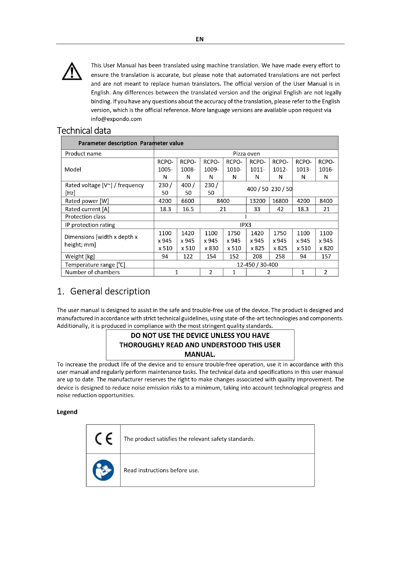 This User Manual has been translated using machine translation. We have made every effort to ensure the translation is accurate, but please note that automated translations are not perfect and are not meant to replace human translators. The official version of the User Manual is in English. Any differences between the translated version and the original English are not legally binding. If you have any questions about the accuracy of the translation, please refer to the English version, which is the official reference. More language versions are available upon request via info@expondo.com