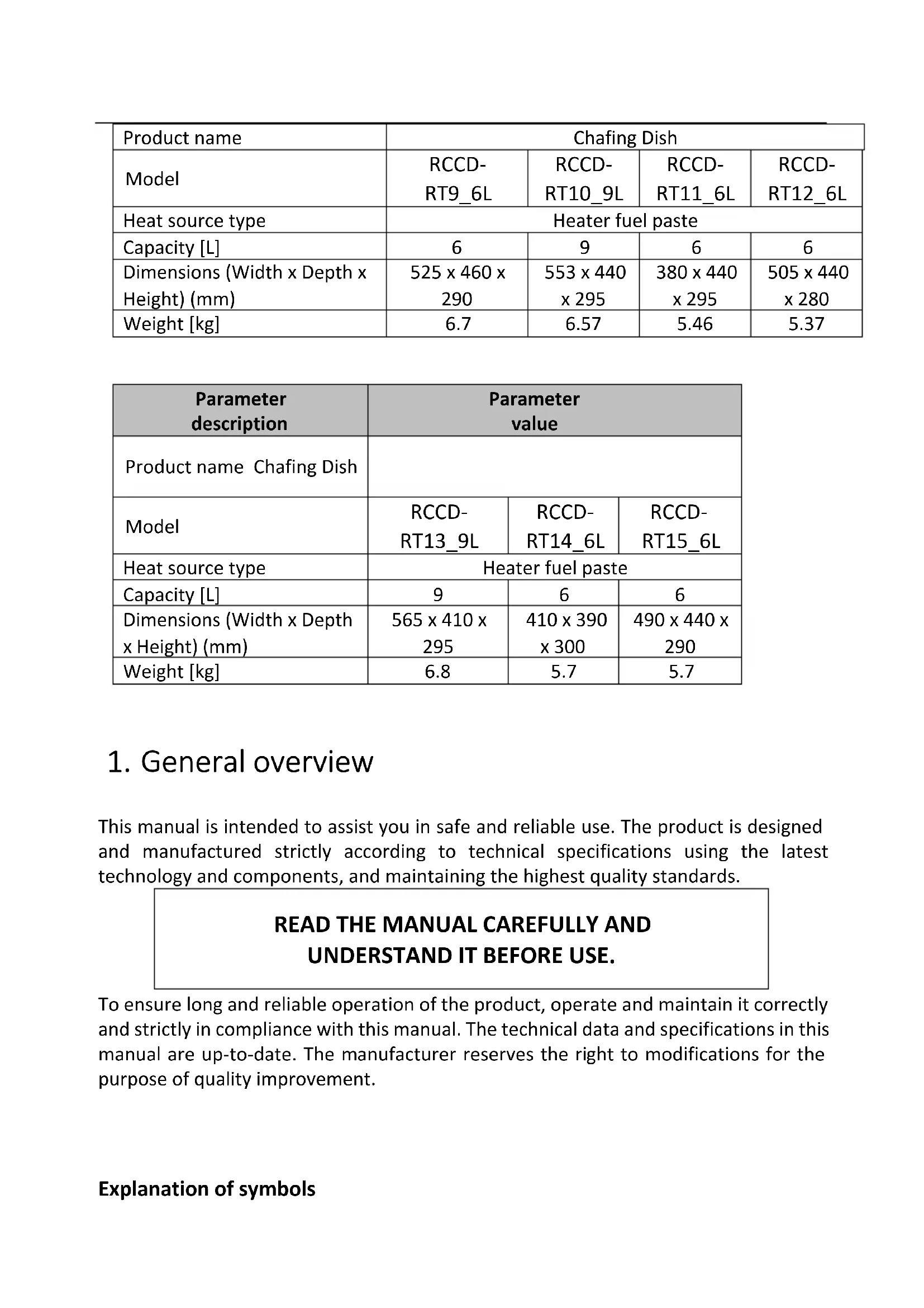 The term “appliance” or “product” in the warnings and instructions refers to the < Chafing Dish>.2.1. SAFETY a) Keep the workplace tidy and well lit. Disorder or poor lighting can lead to accidents. Be careful, watch what you are doing and use common sense when working with the appliance. b) If in doubt as to whether the product is working properly or found to be damaged, contact the manufacturer’s technical service. c) Only the manufacturer’s technical service may repair the product. Do not attempt to repair the product on your own! d) Use the appliance in a well-ventilated room. e) Keep this manual for future reference. If the product is to be handed over to a third party, hand it over with this user manual. f) Keep packaging components and small installation parts out of the reach of children. g) The appliance is not a toy. Children must be supervised to ensure that they do not play with it. h) Clean the appliance regularly to prevent permanent deposits of dirt.