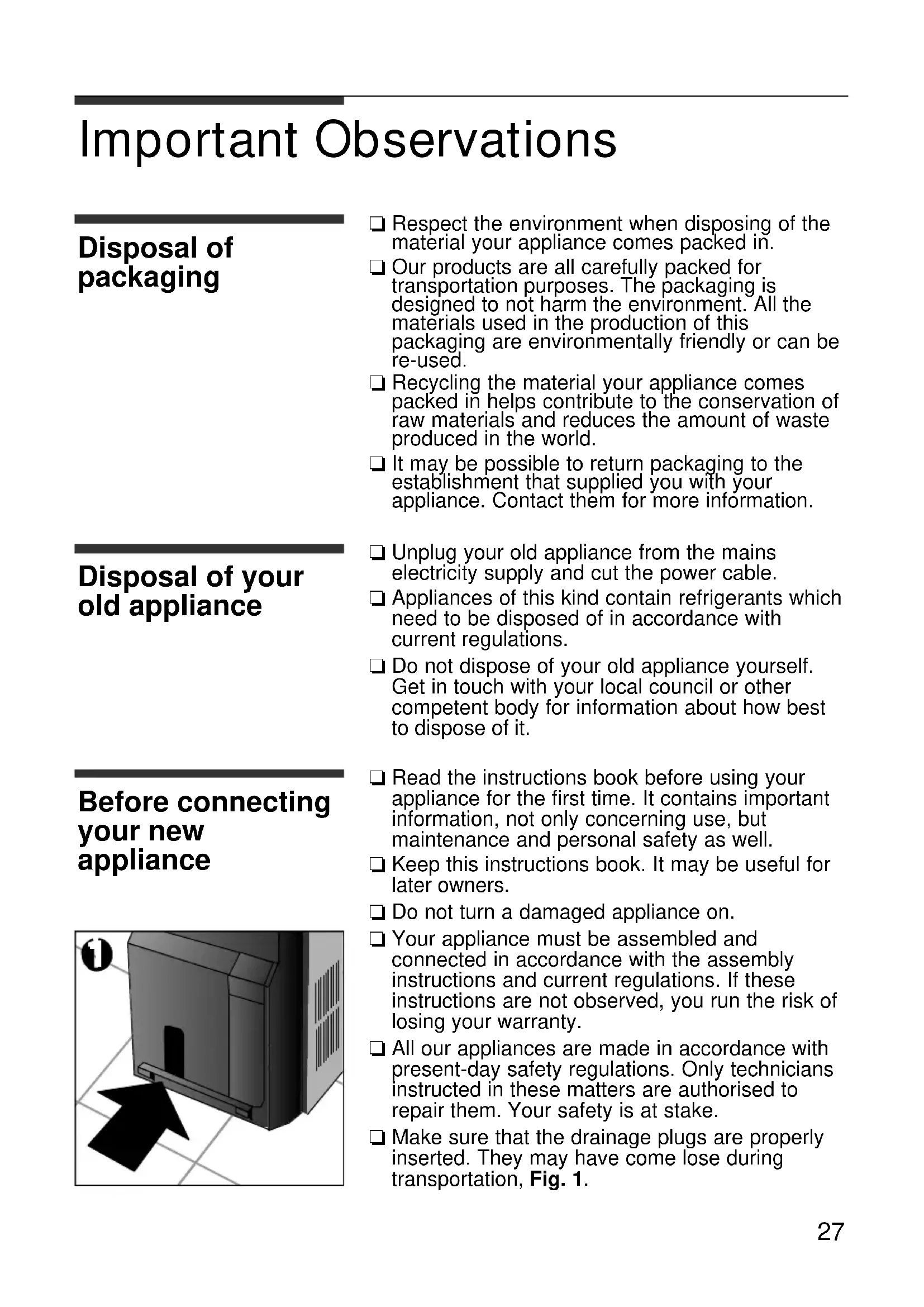 ❏ Read the instructions book before using your appliance for the first time. It contains important information, not only concerning use, but maintenance and personal safety as well. ❏ Keep this instructions book. It may be useful for later owners. ❏ Do not turn a damaged appliance on. ❏ Your appliance must be assembled and connected in accordance with the assembly instructions and current regulations. If these instructions are not observed, you run the risk of losing your warranty. ❏ All our appliances are made in accordance with present-day safety regulations. Only technicians instructed in these matters are authorised to repair them. Your safety is at stake. ❏ Make sure that the drainage plugs are properly inserted. They may have come lose during transportation, Fig. 1. 1Your new appliance Description of your appliance