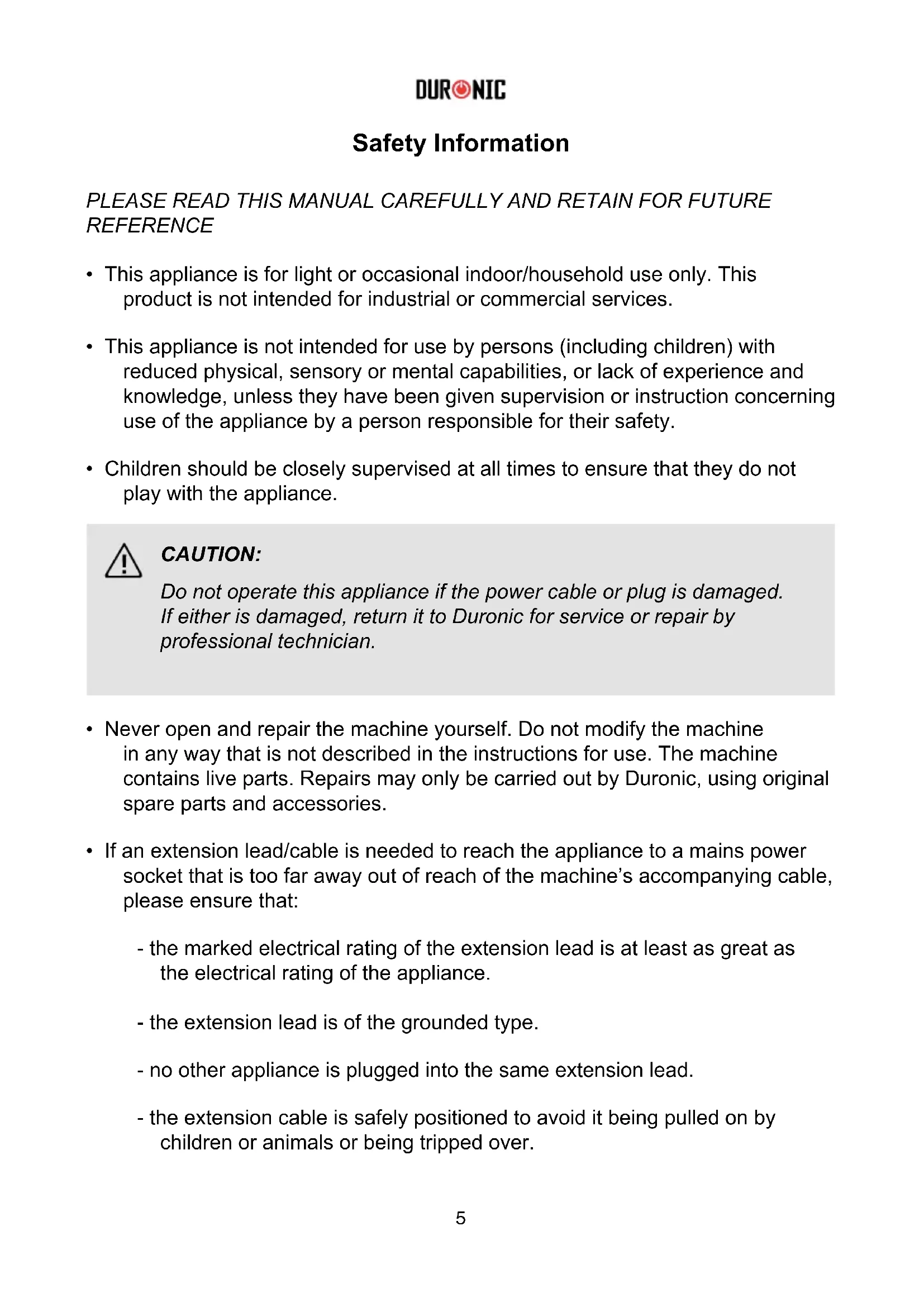- If an extension lead/cable is needed to reach the appliance to a mains power socket that is too far away out of reach of the machine’s accompanying cable, please ensure that: - the marked electrical rating of the extension lead is at least as great as the electrical rating of the appliance. - the extension lead is of the grounded type. - no other appliance is plugged into the same extension lead. - the extension cable is safely positioned to avoid it being pulled on by children or animals or being tripped over. CAUTION: Do not operate this appliance if the power cable or plug is damaged. If either is damaged, return it to Duronic for service or repair by professional technician.6 Safety Information