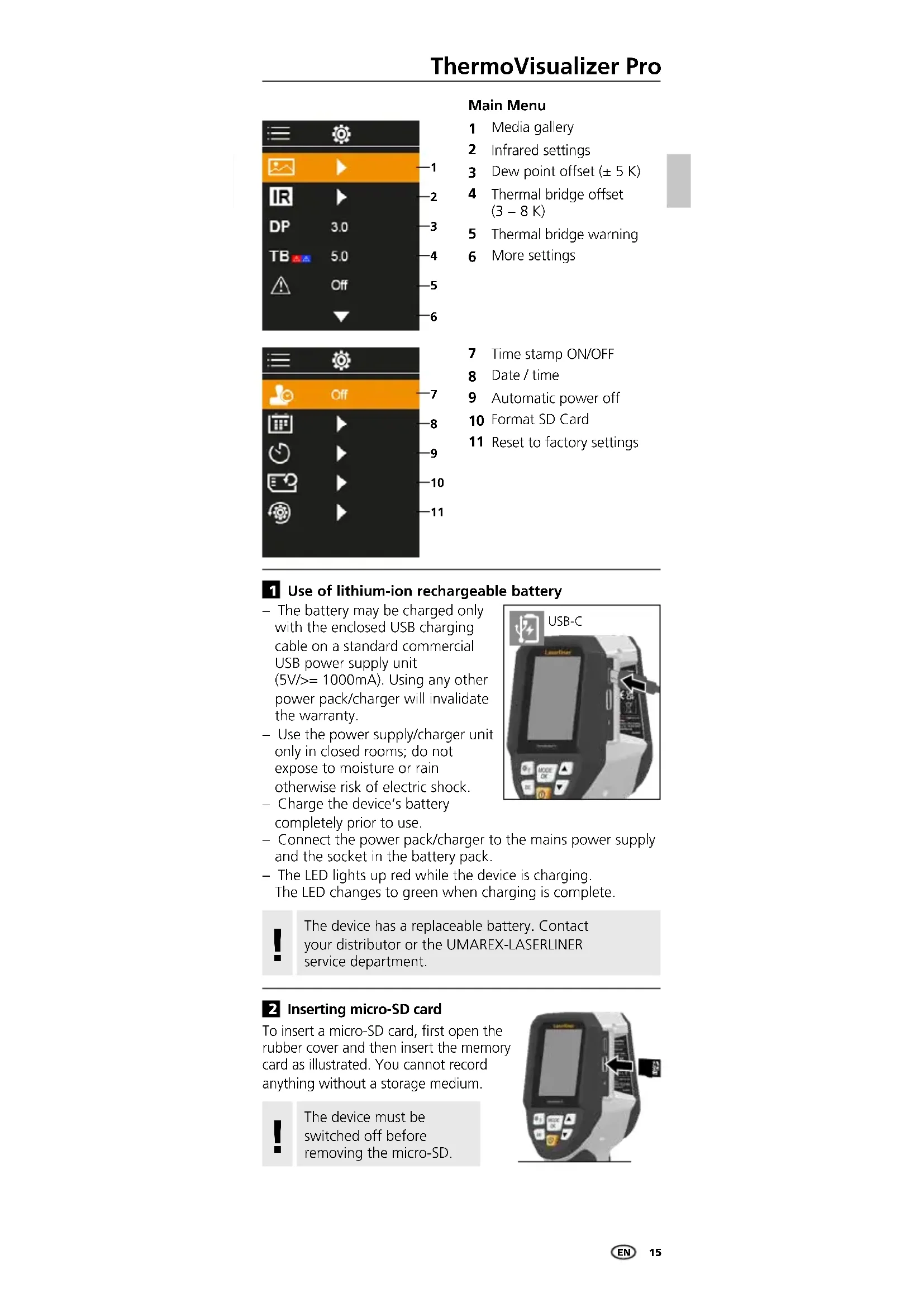 Use of lithium-ion rechargeable battery – The battery may be charged only with the enclosed USB charging cable on a standard commercial USB power supply unit (5V/>= 1000mA). Using any other power pack/charger will invalidate the warranty. – Use the power supply/charger unit only in closed rooms; do not expose to moisture or rain otherwise risk of electric shock. – Charge the device‘s battery completely prior to use. – Connect the power pack/charger to the mains power supply and the socket in the battery pack. – The LED lights up red while the device is charging. The LED changes to green when charging is complete. USB-C Main Menu Media gallery Infrared settings Dew point offset (± 5 K) Thermal bridge offset (3 − 8 K) Thermal bridge warning More settings Time stamp ON/OFF Date / time Automatic power off Format SD Card Reset to factory settings