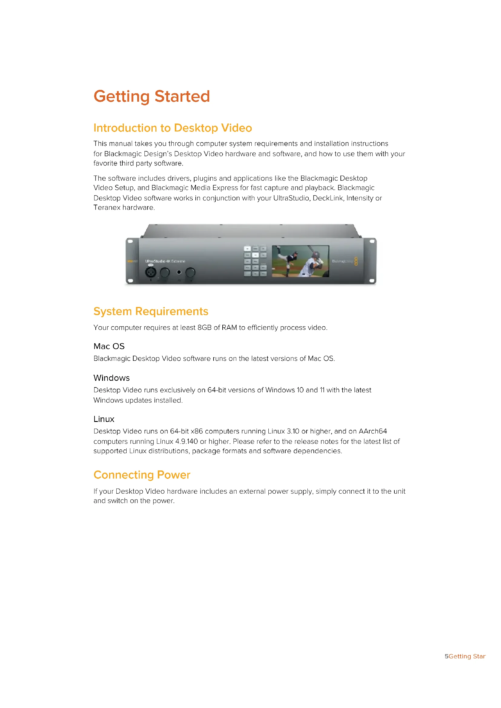 Desktop Video DeckLink UltraStudio Intensity September 2023 Installation and Operation ManualLanguages To go directly to your preferred language, simply click on the hyperlinks listed in the contents below. English 3 日本語 80 Français 158 Deutsch 236 Español 315 中文 393 한국어 471 Русский 549 Italiano 627 Português 705 Türkçe 783Welcome We hope you share our dream for the television industry to become a truly creative industry by allowing anyone to have access to the highest quality video. Previously, high end television and post production required investment in millions of dollars of hardware, however with Blackmagic Design video hardware, even Ultra HD 60p is now easily affordable. We hope you get years of use from your new UltraStudio, DeckLink or Intensity and have fun working with some of the world’s hottest television and design software! This instruction manual should contain all the information you’ll need on installing your Blackmagic Design video hardware. If you’re installing a PCI Express card, it’s always a good idea to ask a technical assistant for help if you have not installed hardware cards into computers before. As Blackmagic Design video hardware uses uncompressed video and the data rates are quite high, you’ll need fast disk storage and a high end computer. We think it should take you approximately 10 minutes to complete installation. Before you install Blackmagic Design video hardware, please check our website at www.blackmagicdesign.com and click the support page to download the latest updates to this manual and Desktop Video driver software. Lastly, please register your Blackmagic Design video hardware when downloading software updates. We would love to keep you updated on new software updates and new features. Perhaps you can even send us your latest show reel of work completed on your Blackmagic Design video hardware and any suggestions for improvements to the software. We are constantly working on new features and improvements, so we would love to hear from you! Grant Petty CEO Blackmagic Design EnglishContents Getting Started 5 Introduction to Desktop Video 5 System Requirements 5 Connecting Power 5 Connecting Video Hardware 6 Installing the Desktop Video Software 10 Capturing and Playing Back Video 15 Blackmagic Desktop Video Setup 16 Introducing Blackmagic Desktop Video Setup 16 Video Settings 17 Connector Mapping for DeckLink Quad 2 22 Audio Settings 23 Conversions Settings 25 Setup 27 About 28 Teranex Mini Smart Panel 29 Attaching a Teranex Mini Smart Panel 29 Smart Panel Features 30 Using UltraStudio 4K Mini’s Front Control Panel 31 Blackmagic Universal Rack Shelf 32 Contents 32 Mounting a Unit to the Rack Shelf 33 Attaching the 1/6 Blanking Panel 33 Attaching the Side 1/3 Width Blanking Panel 33 DaVinci Resolve 34 Live Grading with DaVinci Resolve 34 Editing with DaVinci Resolve 35 Using your Favorite 3rd Party Software 36 Adobe After Eects CC 36 Adobe Photoshop CC 38 Adobe Premiere Pro CC 39 Adobe Character Animator CC 45 Final Cut Pro 46 Avid Media Composer 49 Blackmagic Media Express 56 What is Blackmagic Media Express? 56 Capturing Video and Audio Files 56 Playing back Video and Audio Files 61 Browsing Media 63 Editing Video and Audio Files to Tape 66 Capturing H.265 Video 67 H.265 Hardware Encoder 68 Capturing H.265 Video with UltraStudio 4K Extreme 68 Blackmagic Disk Speed Test 69 Removing the Mezzanine Card from DeckLink 4K Extreme 12G 72 Recovering a DeckLink Card from an Interrupted Update 73 Help 75 Developer Information 76 Regulatory Notices 77 Safety Information 78 Warranty 79 4Desktop VideoGetting Started Introduction to Desktop Video This manual takes you through computer system requirements and installation instructions for Blackmagic Design’s Desktop Video hardware and software, and how to use them with your favorite third party software. The software includes drivers, plugins and applications like the Blackmagic Desktop Video Setup, and Blackmagic Media Express for fast capture and playback. Blackmagic Desktop Video software works in conjunction with your UltraStudio, DeckLink, Intensity or Teranex hardware. System Requirements Your computer requires at least 8GB of RAM to efficiently process video. Mac OS Blackmagic Desktop Video software runs on the latest versions of Mac OS. Windows Desktop Video runs exclusively on 64-bit versions of Windows 10 and 11 with the latest Windows updates installed. Linux Desktop Video runs on 64-bit x86 computers running Linux 3.10 or higher, and on AArch64 computers running Linux 4.9.140 or higher. Please refer to the release notes for the latest list of supported Linux distributions, package formats and software dependencies. Connecting Power If your Desktop Video hardware includes an external power supply, simply connect it to the unit and switch on the power. 5Getting StartedTIP DeckLink 4K Extreme 12G can also be connected to additional power using the power adapter cable included with the card. DeckLink 4K Extreme 12G is very powerfuland we are always looking for ways to provide additional features, such as mezzanine cards for expanded connectivity. For this purpose, we have included a power adapter cable so you can plug in additional power if future hardware expansion on your DeckLink card draws more power than your computer’s PCIe slot can provide. If you need to supply external power to your DeckLink 4K Extreme 12G you can easily use the supplied power adapter cable. Simply disconnect the power from your graphics card and plug it into the adapter cable. The plug willonly connect to one end so there’s no way to connect it incorrectly. Connecting Video Hardware There are three types of connectors your Blackmagic Desktop Video hardware may use toconnect to your computer depending on your model. These connection types include Thunderbolt, USB 3.0, or PCIe. Connecting via Thunderbolt Blackmagic UltraStudio 4K and UltraStudio 4K Extreme feature two Thunderbolt™
