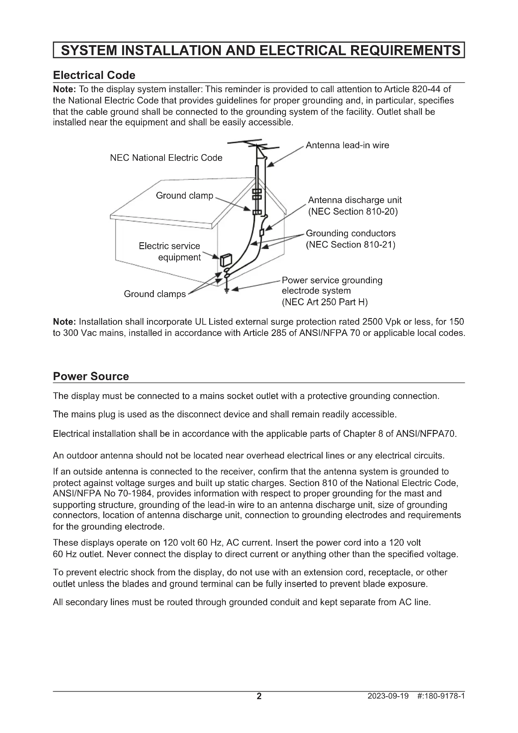 Electrical Code Note: To the display system installer: This reminder is provided to call attention to Article 820-44 of the National Electric Code that provides guidelines for proper grounding and, in particular, species that the cable ground shall be connected to the grounding system of the facility. Outlet shall be installed near the equipment and shall be easily accessible. Antenna discharge unit (NEC Section 810-20) NEC National Electric Code Ground clamp Electric service equipment Ground clamps Power service grounding electrode system (NEC Art 250 Part H) Grounding conductors (NEC Section 810-21) Antenna lead-in wire Power Source The display must be connected to a mains socket outlet with a protective grounding connection. The mains plug is used as the disconnect device and shall remain readily accessible. Electrical installation shall be in accordance with the applicable parts of Chapter 8 of ANSI/NFPA70. An outdoor antenna should not be located near overhead electrical lines or any electrical circuits. If an outside antenna is connected to the receiver, conrm that the antenna system is grounded to protect against voltage surges and built up static charges. Section 810 of the National Electric Code, ANSI/NFPA No 70-1984, provides information with respect to proper grounding for the mast and supporting structure, grounding of the lead-in wire to an antenna discharge unit, size of grounding connectors, location of antenna discharge unit, connection to grounding electrodes and requirements for the grounding electrode. These displays operate on 120 volt 60 Hz, AC current. Insert the power cord into a 120 volt 60 Hz outlet. Never connect the display to direct current or anything other than the specied voltage. To prevent electric shock from the display, do not use with an extension cord, receptacle, or other outlet unless the blades and ground terminal can be fully inserted to prevent blade exposure. All secondary lines must be routed through grounded conduit and kept separate from AC line. Note: Installation shall incorporate UL Listed external surge protection rated 2500 Vpk or less, for 150 to 300 Vac mains, installed in accordance with Article 285 of ANSI/NFPA 70 or applicable local codes.3 2023-09-19 #:180-9178-1 Relevant Information Record your display's model and serial number here for future reference. Keep this user manual in an accessible location in the event service is required. Note: Your display's serial number can be found on the box and underneath the rear cover plate. Model Number ____________________________________ Serial Number ____________________________________ FCC CAUTION To assure continued compliance and possible undesirable interference, ferrite cores may be used when connecting this display to video equipment; maintain at least 400mm (15.75 inches) spacing to other peripheral devices. FCC STATEMENT This equipment has been tested and found to comply with the limits for a Class B digital device, pursuant to Part 15 of the FCC Rule. These limits are designed to provide reasonable protection against harmful interference in a residential installation. This equipment generates, uses and can radiate radio frequency energy and, if not installed and used in accordance with these instructions, may cause harmful interference to radio communications; however, there is no guarantee that interference will not occur in a particular installation. If this equipment does cause harmful interference to radio or television reception, which can be determined by turning the equipment o and on, the user is encouraged to try to correct the interference by one or more of the following measures: