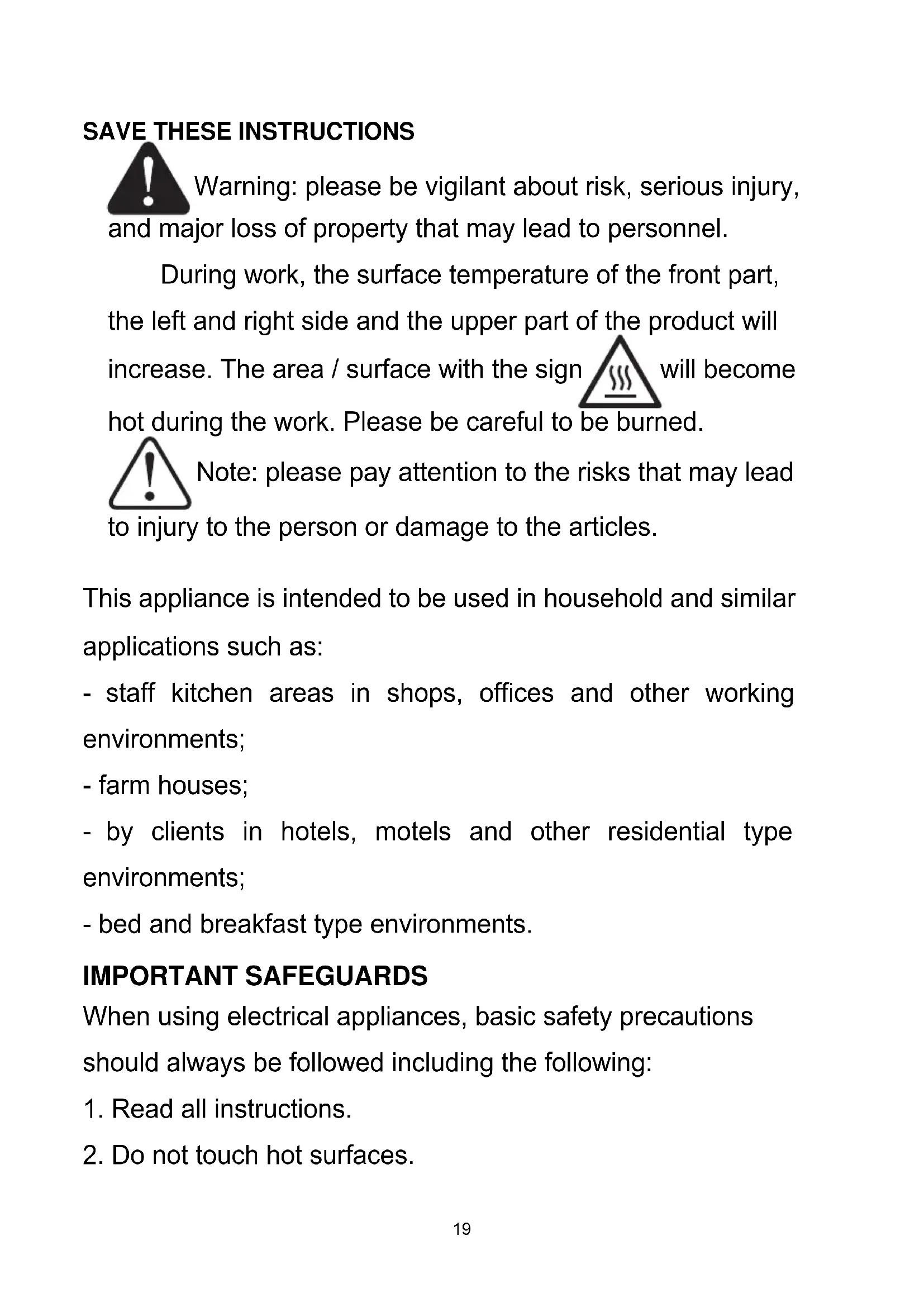 18Warning: please be vigilant about risk, serious injury, and major loss of property that may lead to personnel. During work, the surface temperature of the front part, the left and right side and the upper part of the product will increase. The area / surface with the sign will become hot during the work. Please be careful to be burned. Note: please pay attention to the risks that may lead to injury to the person or damage to the articles. This appliance is intended to be used in household and similar applications such as: - staff kitchen areas in shops, offices and other working environments; - farm houses; - by clients in hotels, motels and other residential type environments; - bed and breakfast type environments. When using electrical appliances, basic safety precautions should always be followed including the following: