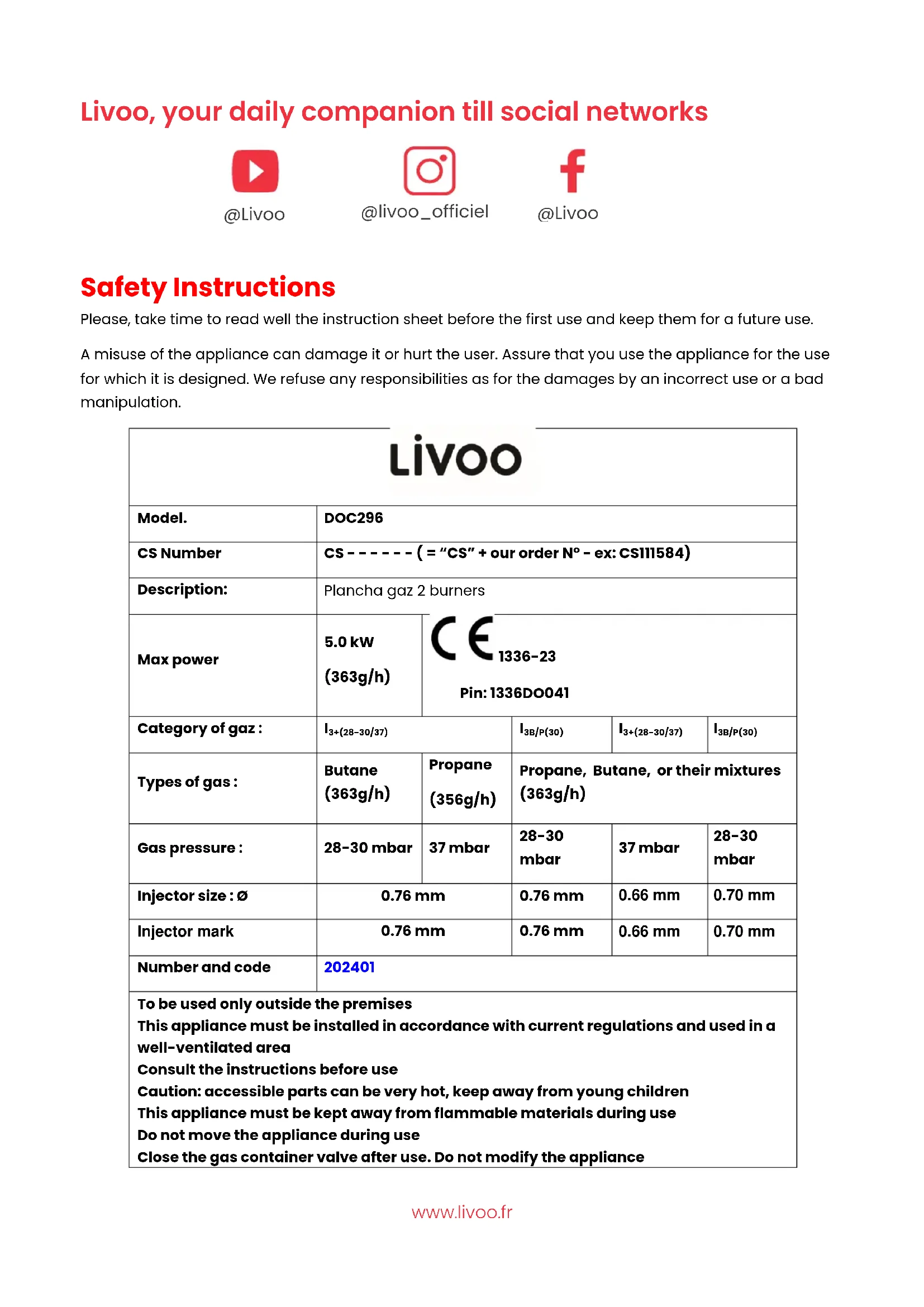 To be used only outside the premises This appliance must be installed in accordance with current regulations and used in a well-ventilated area Consult the instructions before use Caution: accessible parts can be very hot, keep away from young children This appliance must be kept away from flammable materials during use Do not move the appliance during use Close the gas container valve after use. Do not modify the appliance @livoo_officiel @Livoo @Livoowww.livoo.fr