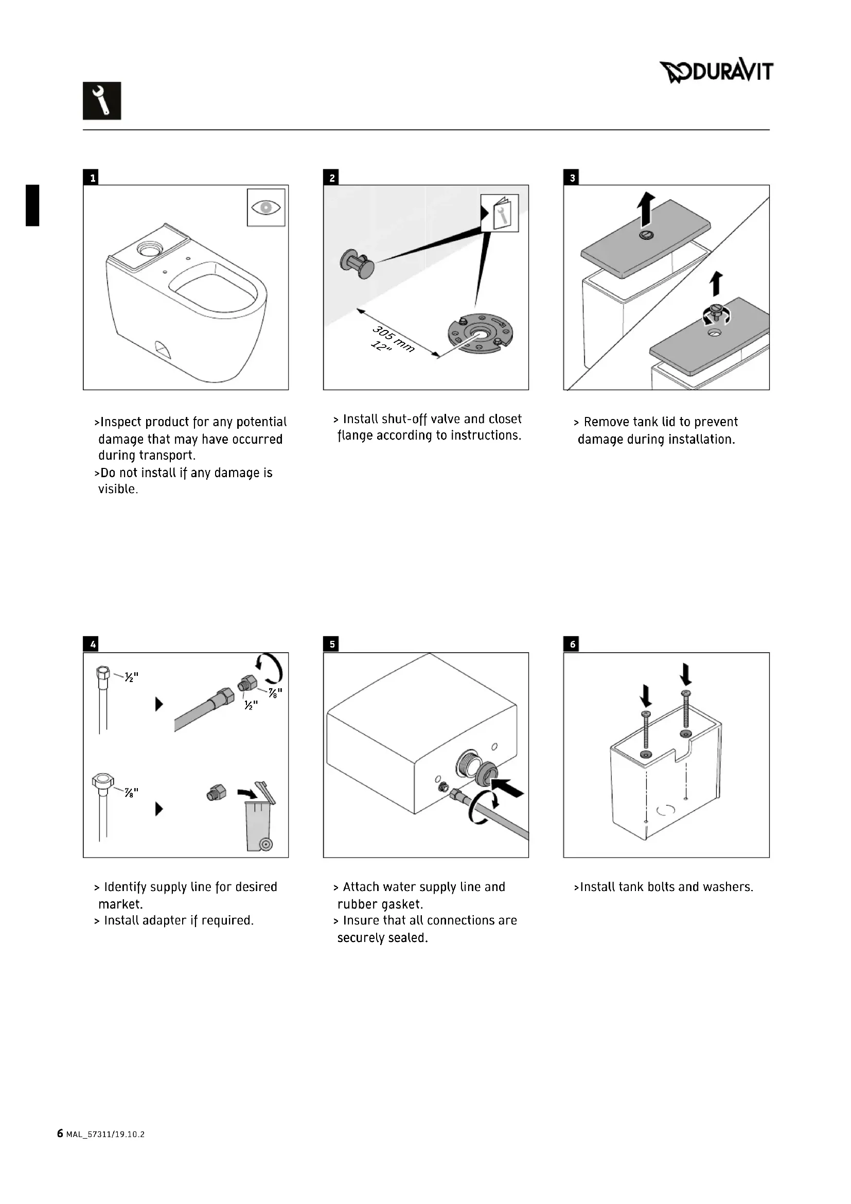 > Install tank bolts and washers. > Inspect product for any potential damage that may have occurred during transport. > Do not install if any damage is visible. > Remove tank lid to prevent damage during installation. > Identify supply line for desired market. > Install adapter if required. > Install shut-off valve and closet flange according to instructions. > Attach water supply line and rubber gasket. > Insure that all connections are securely sealed. 6 MAL_57311/19.10.2
