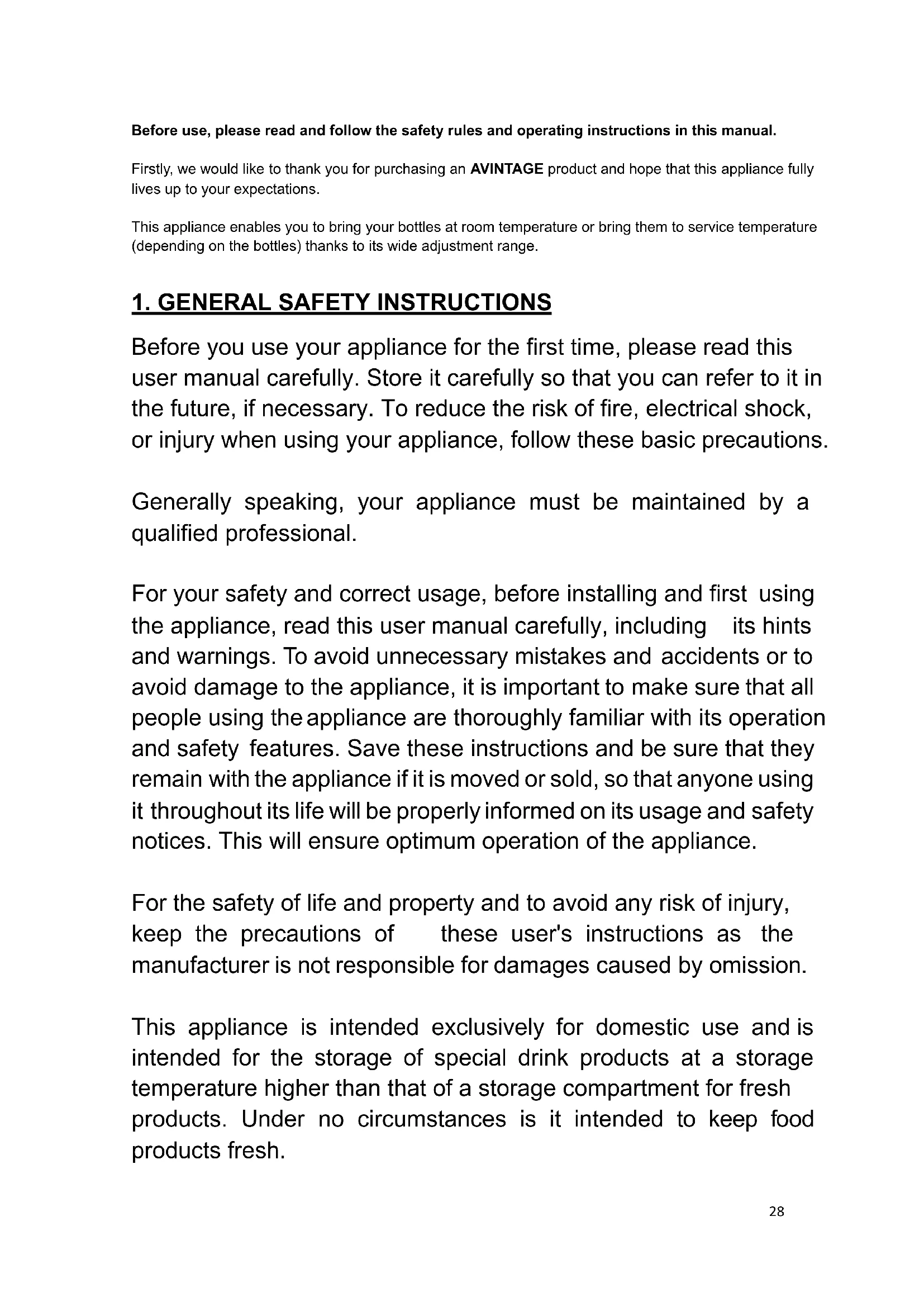 throughout its life will be properly informed on its usage and safety notices. This will ensure optimum operation of the appliance. For the safety of life and property and to avoid any risk of injury, keep the precautions of these user's instructions as the manufacturer is not responsible for damages caused by omission. This appliance is intended exclusively for domestic use and is intended for the storage of special drink products at a storage temperature higher than that of a storage compartment for fresh products. Under no circumstances is it intended to keep food products fresh.29