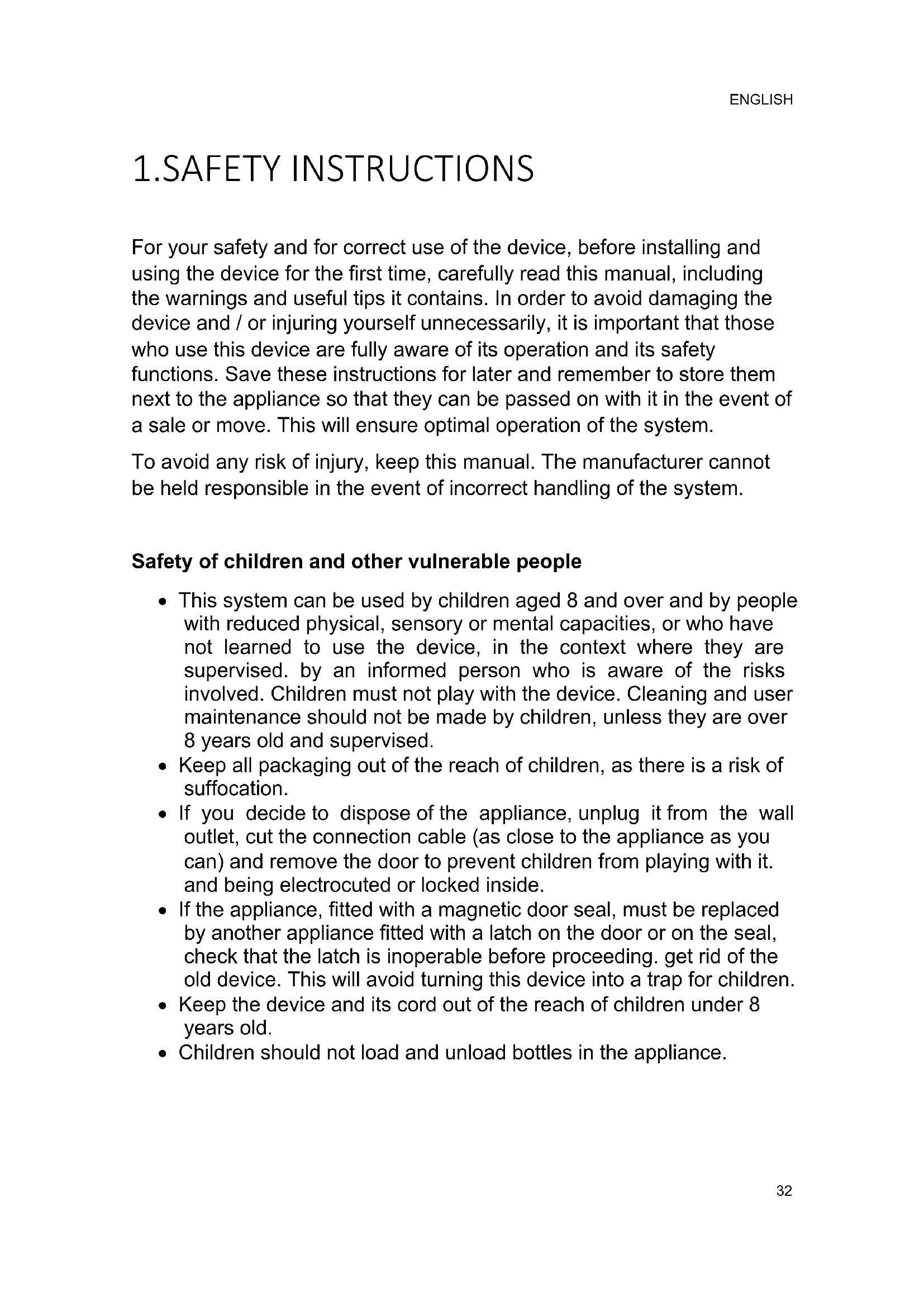 1.SAFETY INSTRUCTIONS For your safety and for correct use of the device, before installing and using the device for the first time, carefully read this manual, including the warnings and useful tips it contains. In order to avoid damaging the device and / or injuring yourself unnecessarily, it is important that those who use this device are fully aware of its operation and its safety functions. Save these instructions for later and remember to store them next to the appliance so that they can be passed on with it in the event of a sale or move. This will ensure optimal operation of the system. To avoid any risk of injury, keep this manual. The manufacturer cannot be held responsible in the event of incorrect handling of the system. Safety of children and other vulnerable people