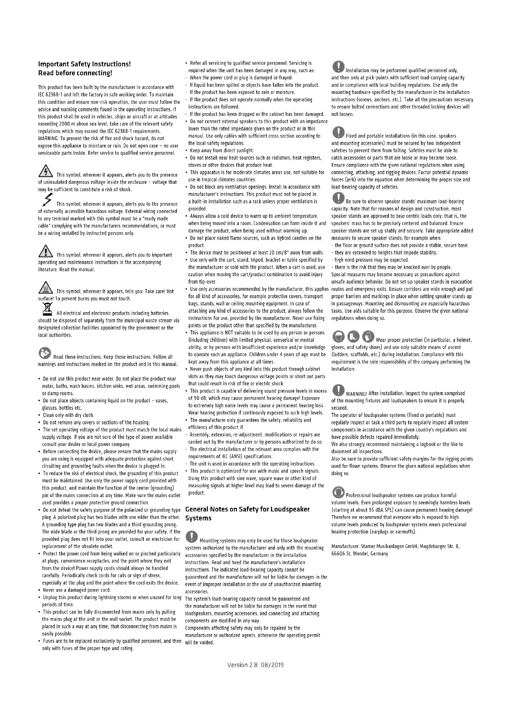 - This product is optimized for use with music and speech signals. Using this product with sine wave, square wave or other kind of measuring signals at higher level may lead to severe damage of the product. General Notes on Safety for Loudspeaker Systems Mounting systems may only be used for those loudspeaker systems authorized by the manufacturer and only with the mounting accessories specified by the manufacturer in the installation instructions. Read and heed the manufacturer’s installation instructions. The indicated load-bearing capacity cannot be guaranteed and the manufacturer will not be liable for damages in the event of improper installation or the use of unauthorized mounting accessories. The system’s load-bearing capacity cannot be guaranteed and the manufacturer will not be liable for damages in the event that loudspeakers, mounting accessories, and connecting and attaching components are modified in any way. Components affecting safety may only be repaired by the manufacturer or authorized agents, otherwise the operating permit will be voided. Installation may be performed qualified personnel only, and then only at pick-points with sufficient load-carrying capacity and in compliance with local building regulations. Use only the mounting hardware specified by the manufacturer in the installation instructions (screws, anchors, etc.). Take all the precautions necessary to ensure bolted connections and other threaded locking devices will not loosen. Fixed and portable installations (in this case, speakers and mounting accessories) must be secured by two independent safeties to prevent them from falling. Safeties must be able to catch accessories or parts that are loose or may become loose. Ensure compliance with the given national regulations when using connecting, attaching, and rigging devices. Factor potential dynamic forces (jerk) into the equation when determining the proper size and load-bearing capacity of safeties. Be sure to observe speaker stands’ maximum load-bearing capacity. Note that for reasons of design and construction, most speaker stands are approved to bear centric loads only; that is, the speakers’ mass has to be precisely centered and balanced. Ensure speaker stands are set up stably and securely. Take appropriate added measures to secure speaker stands, for example when: - the floor or ground surface does not provide a stable, secure base. - they are extended to heights that impede stability. - high wind pressure may be expected. - there is the risk that they may be knocked over by people. Special measures may become necessary as precautions against unsafe audience behavior. Do not set up speaker stands in evacuation routes and emergency exits. Ensure corridors are wide enough and put proper barriers and markings in place when setting speaker stands up in passageways. Mounting and dismounting are especially hazardous tasks. Use aids suitable for this purpose. Observe the given national regulations when doing so. Wear proper protection (in particular, a helmet, gloves, and safety shoes) and use only suitable means of ascent (ladders, scaffolds, etc.) during installation. Compliance with this requirement is the sole responsibility of the company performing the installation. WARNING! After installation, inspect the system comprised of the mounting fixtures and loudspeakers to ensure it is properly secured. The operator of loudspeaker systems (fixed or portable) must regularly inspect or task a third party to regularly inspect all system components in accordance with the given country’s regulations and have possible defects repaired immediately. We also strongly recommend maintaining a logbook or the like to document all inspections. Also be sure to provide sufficient safety margins for the rigging points used for flown systems. Observe the given national regulations when doing so. Professional loudspeaker systems can produce harmful volume levels. Even prolonged exposure to seemingly harmless levels (starting at about 95 dBA SPL) can cause permanent hearing damage! Therefore we recommend that everyone who is exposed to high volume levels produced by loudspeaker systems wears professional hearing protection (earplugs or earmuffs). Manufacturer: Stamer Musikanlagen GmbH, Magdeburger Str. 8, 66606 St. Wendel, Germany Version 2.8 08/2019PREMIUM PR:O D2 1.0