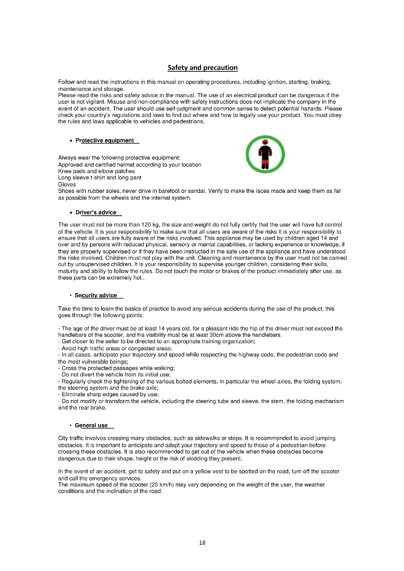 - General use City traffic involves crossing many obstacles, such as sidewalks or steps. It is recommended to avoid jumping obstacles. It is important to anticipate and adapt your trajectory and speed to those of a pedestrian before crossing these obstacles. It is also recommended to get out of the vehicle when these obstacles become dangerous due to their shape, height or the risk of skidding they present. In the event of an accident, get to safety and put on a yellow vest to be spotted on the road, turn off the scooter and call the emergency services. The maximum speed of the scooter (25 km/h) may vary depending on the weight of the user, the weather conditions and the inclination of the road.19