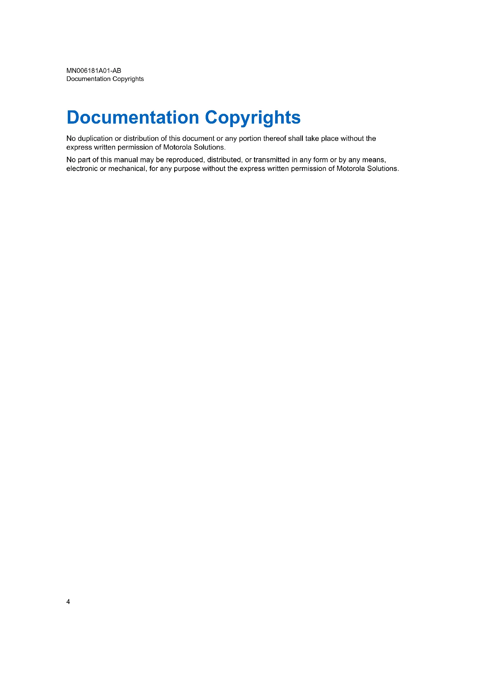 MN006181A01-AB Contents 3Documentation Copyrights No duplication or distribution of this document or any portion thereof shall take place without the express written permission of Motorola Solutions. No part of this manual may be reproduced, distributed, or transmitted in any form or by any means, electronic or mechanical, for any purpose without the express written permission of Motorola Solutions. MN006181A01-AB Documentation Copyrights 4Disclaimer The information in this document is carefully examined, and is believed to be entirely reliable. However, no responsibility is assumed for inaccuracies. Furthermore, Motorola Solutions reserves the right to make changes to any products herein to improve readability, function, or design. Motorola Solutions does not assume any liability arising out of the applications or use of any product or circuit described herein; nor does it cover any license under its patent rights, nor the rights of others. MN006181A01-AB Disclaimer 5Computer Software Copyrights The Motorola Solutions products described in this manual may include copyrighted Motorola Solutions computer programs stored in semiconductor memories or other media. Laws in the United States and other countries preserve for Motorola Solutions certain exclusive rights for copyrighted computer programs, including, but not limited to, the exclusive right to copy or reproduce in any form the copyrighted computer program. Accordingly, any copyrighted Motorola Solutions computer programs contained in the Motorola Solutions products described in this manual may not be copied, reproduced, modified, reverse-engineered, or distributed in any manner without the express written permission of Motorola Solutions. Furthermore, the purchase of Motorola Solutions products shall not be deemed to grant either directly or by implication, estoppel, or otherwise, any license under the copyrights, patents or patent applications of Motorola Solutions, except for the normal non-exclusive license to use that arises by operation of law in the sale of a product. MN006181A01-AB Computer Software Copyrights 6Batteries, Chargers, and Audio Accessories Safety Information This document contains important safety and operating instructions. Read these instructions carefully and save them for future reference. Before using the battery charger, read all the instructions and cautionary markings on: