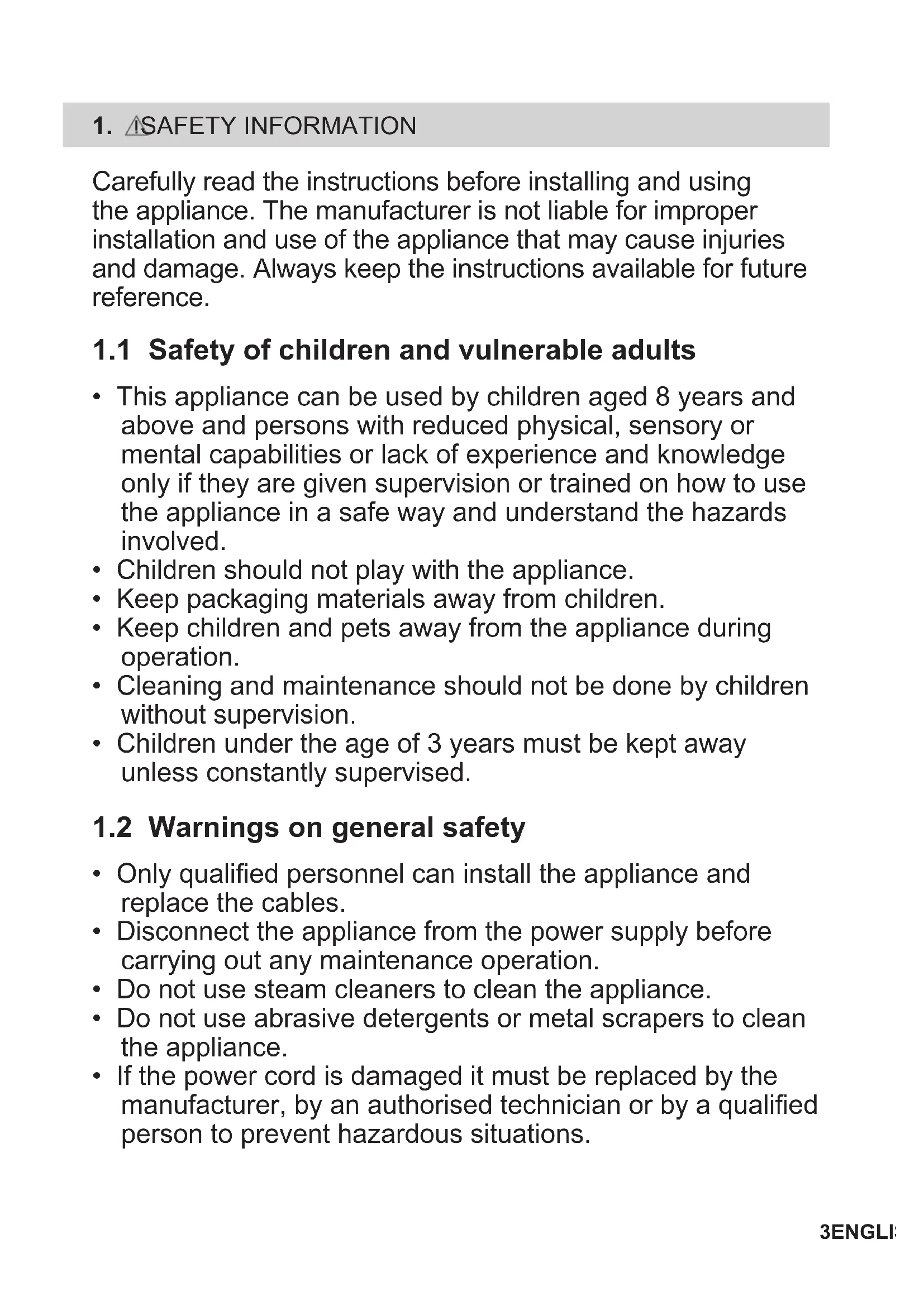 Carefully read the instructions before installing and using the appliance. The manufacturer is not liable for improper installation and use of the appliance that may cause injuries and damage. Always keep the instructions available for future reference.