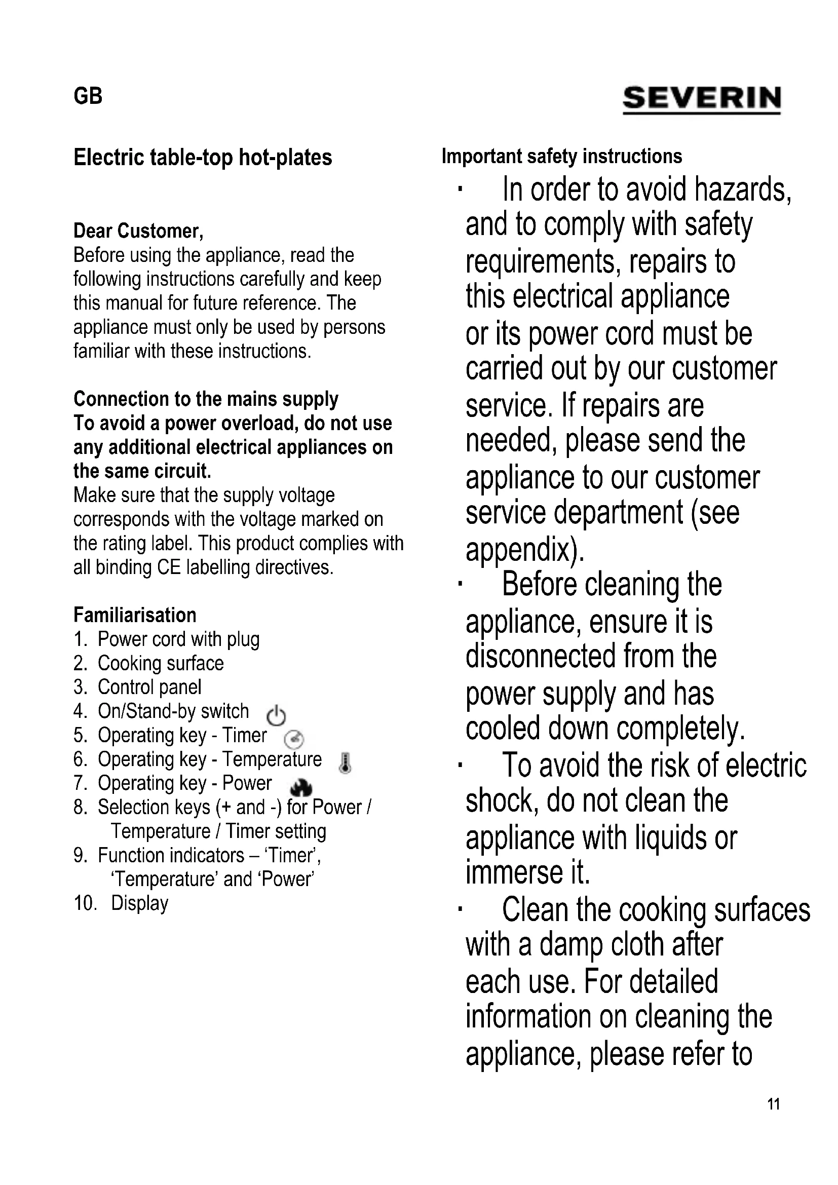 Electric table-top hot-plates Dear Customer, Before using the appliance, read the following instructions carefully and keep this manual for future reference. The appliance must only be used by persons familiar with these instructions. Connection to the mains supply To avoid a power overload, do not use any additional electrical appliances on the same circuit. Make sure that the supply voltage corresponds with the voltage marked on the rating label. This product complies with all binding CE labelling directives. Familiarisation