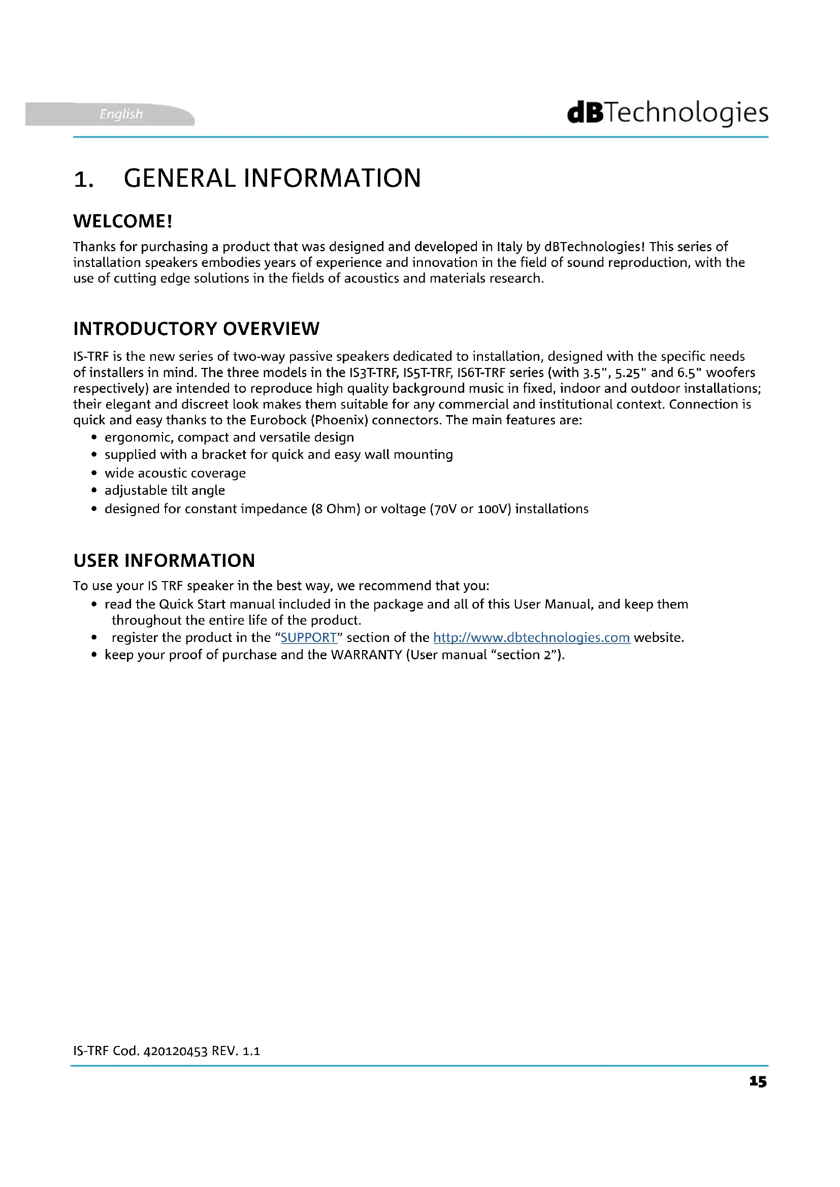 WELCOME! Thanks for purchasing a product that was designed and developed in Italy by dBTechnologies! This series of installation speakers embodies years of experience and innovation in the field of sound reproduction, with the use of cutting edge solutions in the fields of acoustics and materials research. INTRODUCTORY OVERVIEW IS-TRF is the new series of two-way passive speakers dedicated to installation, designed with the specific needs of installers in mind. The three models in the IS3T-TRF, IS5T-TRF, IS6T-TRF series (with 3.5", 5.25" and 6.5" woofers respectively) are intended to reproduce high quality background music in fixed, indoor and outdoor installations; their elegant and discreet look makes them suitable for any commercial and institutional context. Connection is quick and easy thanks to the Eurobock (Phoenix) connectors. The main features are: