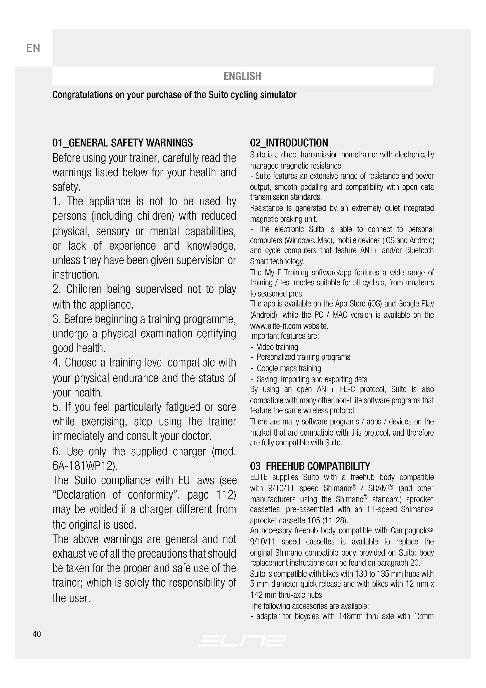 6A-181WP12). The Suito compliance with EU laws (see “Declaration of conformity”, page 112) may be voided if a charger different from the original is used. The above warnings are general and not exhaustive of all the precautions that should be taken for the proper and safe use of the trainer; which is solely the responsibility of the user. 02_INTRODUCTION Suito is a direct transmission hometrainer with electronically managed magnetic resistance. - Suito features an extensive range of resistance and power output, smooth pedalling and compatibility with open data transmission standards. Resistance is generated by an extremely quiet integrated magnetic braking unit. - The electronic Suito is able to connect to personal computers (Windows, Mac), mobile devices (iOS and Android) and cycle computers that feature ANT+ and/or Bluetooth Smart technology. The My E-Training software/app features a wide range of training / test modes suitable for all cyclists, from amateurs to seasoned pros. The app is available on the App Store (iOS) and Google Play (Android), while the PC / MAC version is available on the www.elite-it.com website. Important features are: - Video training - Personalized training programs - Google maps training - Saving, importing and exporting data By using an open ANT+ FE-C protocol, Suito is also compatible with many other non-Elite software programs that feature the same wireless protocol. There are many software programs / apps / devices on the market that are compatible with this protocol, and therefore are fully compatible with Suito. 03_FREEHUB COMPATIBILITY ELITE supplies Suito with a freehub body compatible with 9/10/11 speed Shimano