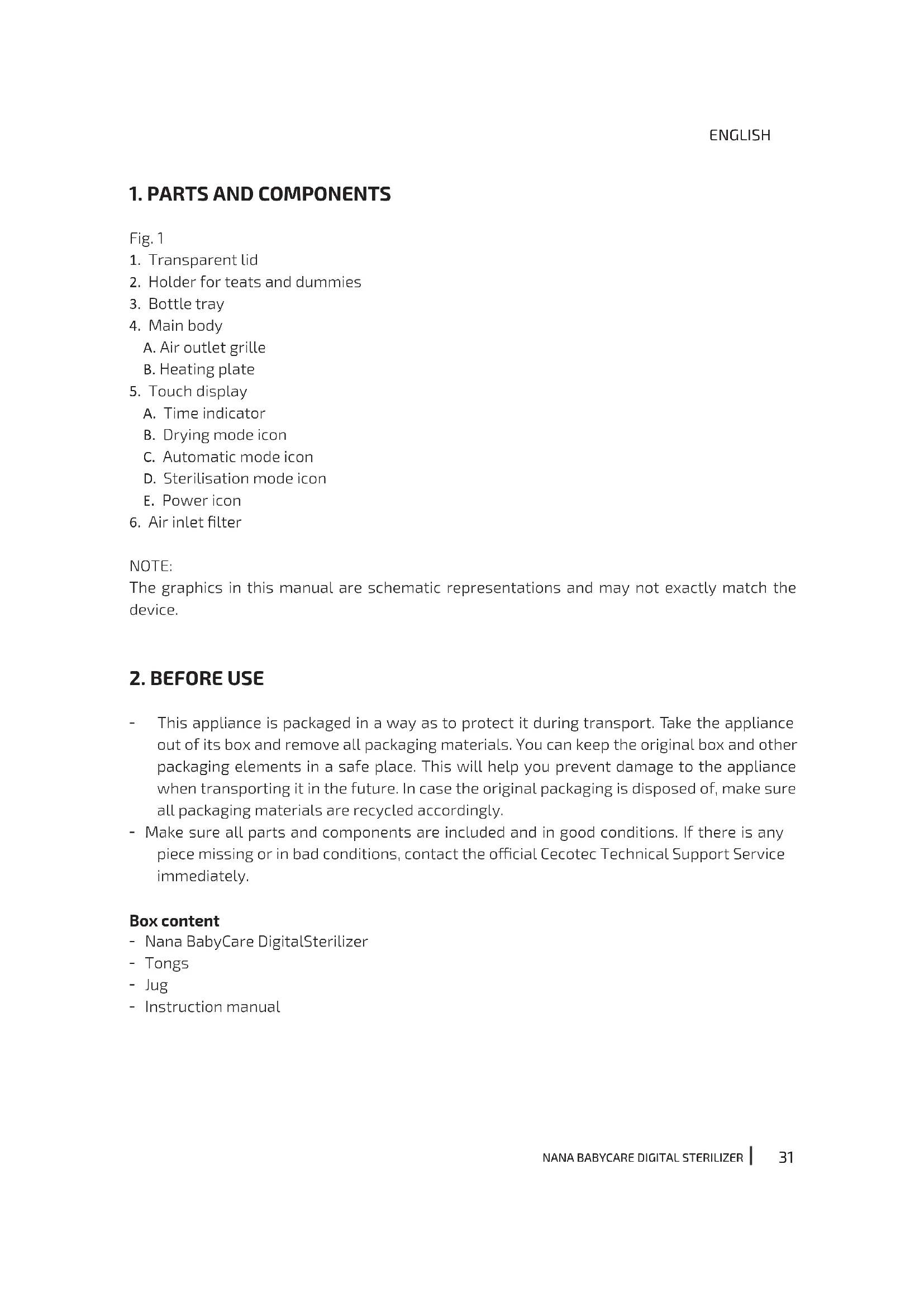 - This appliance is packaged in a way as to protect it during transport. Take the appliance out of its box and remove all packaging materials. You can keep the original box and other packaging elements in a safe place. This will help you prevent damage to the appliance when transporting it in the future. In case the original packaging is disposed of, make sure all packaging materials are recycled accordingly. - Make sure all parts and components are included and in good conditions. If there is any piece missing or in bad conditions, contact the ocial Cecotec Technical Support Service immediately. Box content - Nana BabyCare DigitalSterilizer - Tongs - Jug - Instruction manualNANA BABYCARE DIGITAL STERILIZER