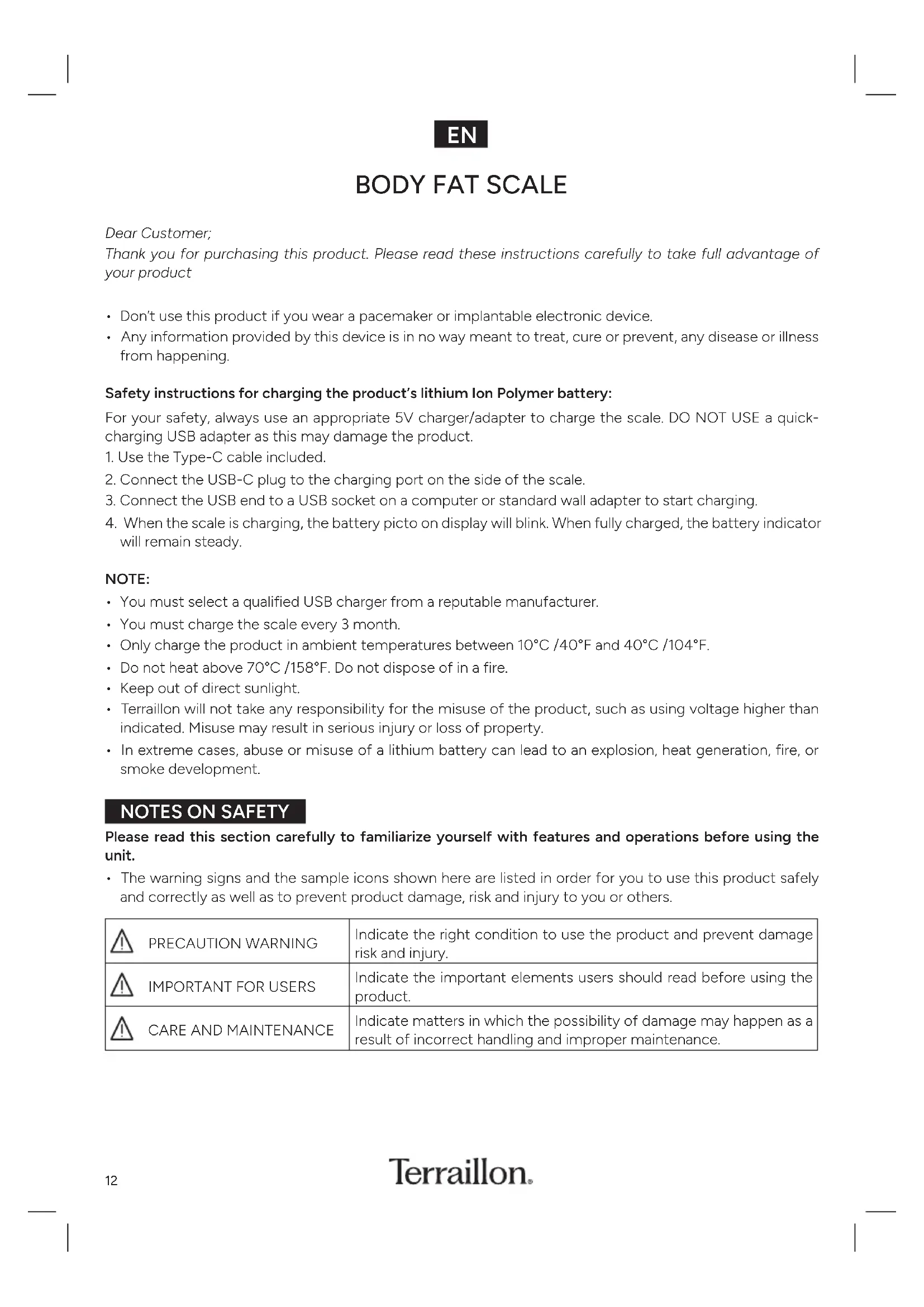 - Terraillon will not take any responsibility for the misuse of the product, such as using voltage higher than indicated Misuse may result in serious injury or loss of property