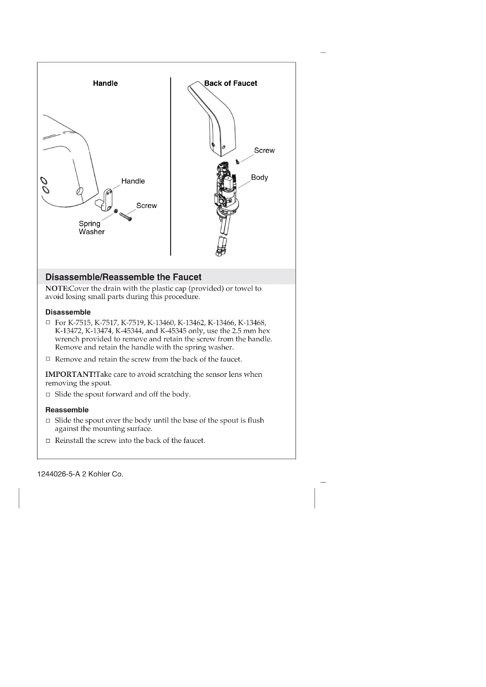 Homeowners Guide Bathroom Sink Faucet K-7514, K-7515, K-7516, K-7517, K-7518, K-7519, K-13460, K-13461, K-13462, K-13463, K-13466, K-13467, K-13468, K-13469, K-13472, K-13473, K-13474, K-13475, K-45344, K-45345 M product numbers are for Mexico (i.e. K-12345M) Los números de productos seguidos de M corresponden a México (e.j. K-12345M) Français, page “Français-1” Español, pagina “Español-1” 1244026-5-ADisassemble/Reassemble the Faucet NOTE: Cover the drain with the plastic cap (provided) or towel to avoid losing small parts during this procedure. Disassemble For K-7515, K-7517, K-7519, K-13460, K-13462, K-13466, K-13468, K-13472, K-13474, K-45344, and K-45345 only, use the 2.5 mm hex wrench provided to remove and retain the screw from the handle. Remove and retain the handle with the spring washer. Remove and retain the screw from the back of the faucet. IMPORTANT! Take care to avoid scratching the sensor lens when removing the spout. Slide the spout forward and off the body. Reassemble Slide the spout over the body until the base of the spout is flush against the mounting surface. Reinstall the screw into the back of the faucet. Handle Spring Washer Screw Handle Body Screw Back of Faucet 1244026-5-A 2 Kohler Co.Disassemble/Reassemble the Faucet (cont.) For K-7515, K-7517, K-7519, K-13460, K-13462, K-13466, K-13468, K-13472, K-13474, K-45344, and K-45345 only, reinsert the handle with spring washer into the faucet. Reinstall the screw to secure the handle to the faucet. If the Hybrid Energy Cell (HEC) has just been replaced, wait approximately 2 minutes to allow the faucet to cycle through the automatic sensing distance. If the power was interrupted, wait approximately 2 minutes to allow the faucet to cycle through the automatic sensing distance. Kohler Co. 3 1244026-5-ARemoving the Vandal Resistant Plug NOTE: Disassemble the faucet following the steps in the ″Disassemble/Reassemble the Faucet″ section. From inside the faucet body, use a screwdriver to pop out the vandal-resistant plug button. If you are adjusting the temperature, go to the ″Temperature Limiting Adjustment″ section and follow the instructions. If you are installing the handle assembly, refer to the illustration in the ″Temperature Limiting Adjustment″ section. Position the plug button and firmly press into place. Vandal-Resistant Plug Button 1244026-5-A 4 Kohler Co.Temperature Limit Adjustment CAUTION: Risk of personal injury. Scalding may result if the temperature limit is not properly set. NOTE: The water temperature does not need to be adjusted if the water temperature is below 105°F (41°C). NOTE: Use a thermometer rated for 120°F (49°C) or greater. NOTE: When using a tempered water supply, install the vandal-resistant plug button. Adjust the Water Temperature Limit – Handle Installations Turn on the water and adjust to full hot by turning the handle toward the back of the faucet until it stops. Determine the water temperature using a thermometer. If the temperature exceeds 105°F (41°C), complete the following steps. NOTICE: Do not rotate the handle when removing the screw. Using the 2.5 mm hex wrench provided, remove and retain the handle screw. Remove and retain the handle with the spring washer. Handle Screw Vandal-Resistant Plug Button Spring Washer Kohler Co. 5 1244026-5-ATemperature Limit Adjustment (cont.) Insert the handle at the desired maximum temperature. If the handle is inserted horizontally: This is the maximum hot temperature, where the water will be the same temperature as the water from the hot water supply. If the handle is inserted vertically (shown): This is the lowest cold temperature, where the water will be the same temperature as the water from the cold water supply. NOTICE: Do not rotate the handle when reinstalling the screw. Reinstall the spring washer into the handle, then attach the handle to the faucet. Secure the handle to the faucet with the screw. Adjust the Water Temperature Limit – Vandal-Resistant Installations NOTE: Save the handle to adjust the water temperature at a later date. Using the handle, adjust the water to the desired temperature. Using the 2.5 mm hex wrench provided, remove and retain the screw, spring washer, and handle. Position the vandal-resistant plug button and firmly press into place. 1244026-5-A 6 Kohler Co.Service the Battery Applies to K-13460, K-13461, K-13466, K-13467, K-13472, and K-13473. Disassemble the faucet to access the battery case. Refer to the ″Disassemble/Reassemble the Faucet″ section. Using a small torx screwdriver, remove and retain the two screws from the battery case cover. Insert two AAA Alkaline batteries (not provided) into the battery case. Reinstall the two screws into the battery case. Reassemble the faucet. Wait approximately 2 minutes to allow the faucet to cycle through the automatic sensing distance before use. Battery Case Battery Cover Screws AAA Alkaline batteries Kohler Co. 7 1244026-5-ARemove Aerator Using the key provided, remove the aerator from the spout. If applicable, uncover the drain. Turn on the water supply and check for leaks. Allow the water to run through the spout for about 1 minute to remove any debris. Check for leaks and adjust as needed. Temporarily cover the sensors on the faucet or close the water supplies. Using the key provided, reinstall the aerator to the spout. Uncover the sensors on the faucet or turn on the water supplies. Care and Cleaning For best results, keep the following in mind when caring for your KOHLER product: