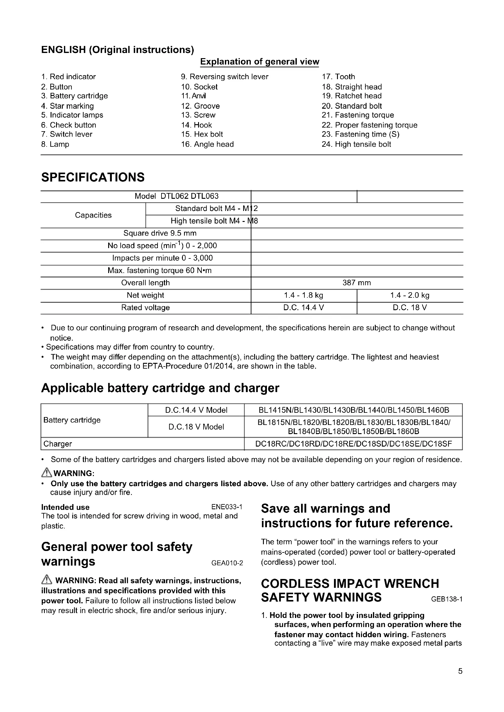 ) 0 - 2,000 Impacts per minute 0 - 3,000 Max. fastening torque 60 N•m Overall length 387 mm Net weight 1.4 - 1.8 kg 1.4 - 2.0 kg Rated voltage D.C. 14.4 V D.C. 18 V Battery cartridge D.C.14.4 V Model BL1415N/BL1430/BL1430B/BL1440/BL1450/BL1460B D.C.18 V Model BL1815N/BL1820/BL1820B/BL1830/BL1830B/BL1840/ BL1840B/BL1850/BL1850B/BL1860B Charger DC18RC/DC18RD/DC18RE/DC18SD/DC18SE/DC18SF6 of the power tool “live” and could give the operator an electric shock.