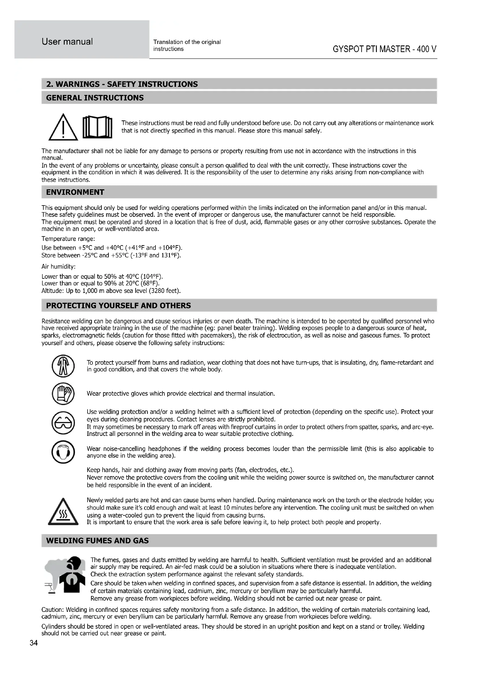 GENERAL INSTRUCTIONS These instructions must be read and fully understood before use. Do not carry out any alterations or maintenance work thatisnotdirectlyspeciedinthismanual.Pleasestorethismanualsafely. The manufacturer shall not be liable for any damage to persons or property resulting from use not in accordance with the instructions in this manual. Intheeventofanyproblemsoruncertainty,pleaseconsultapersonqualiedtodealwiththeunitcorrectly.Theseinstructionscoverthe equipment in the condition in which it was delivered. It is the responsibility of the user to determine any risks arising from non-compliance with these instructions. ENVIRONMENT This equipment should only be used for welding operations performed within the limits indicated on the information panel and/or in this manual. These safety guidelines must be observed. In the event of improper or dangerous use, the manufacturer cannot be held responsible. Theequipmentmustbeoperatedandstoredinalocationthatisfreeofdust,acid,ammablegasesoranyothercorrosivesubstances.Operatethe machine in an open, or well-ventilated area. Temperature range: Use between +5°C and +40°C (+41°F and +104°F). Store between -25°C and +55°C (-13°F and 131°F). Air humidity: Lower than or equal to 50% at 40°C (104°F). Lower than or equal to 90% at 20°C (68°F). Altitude: Up to 1,000 m above sea level (3280 feet).